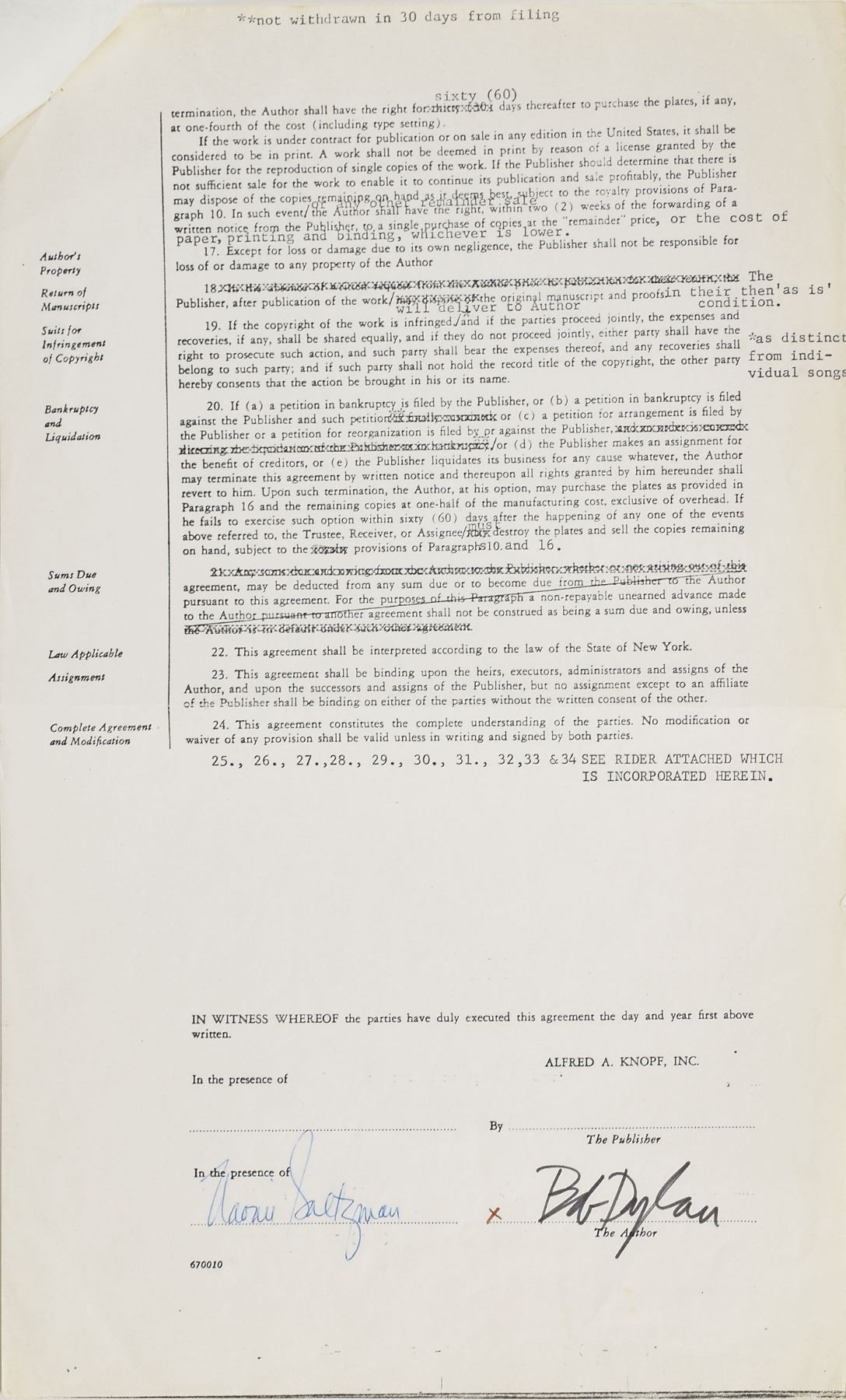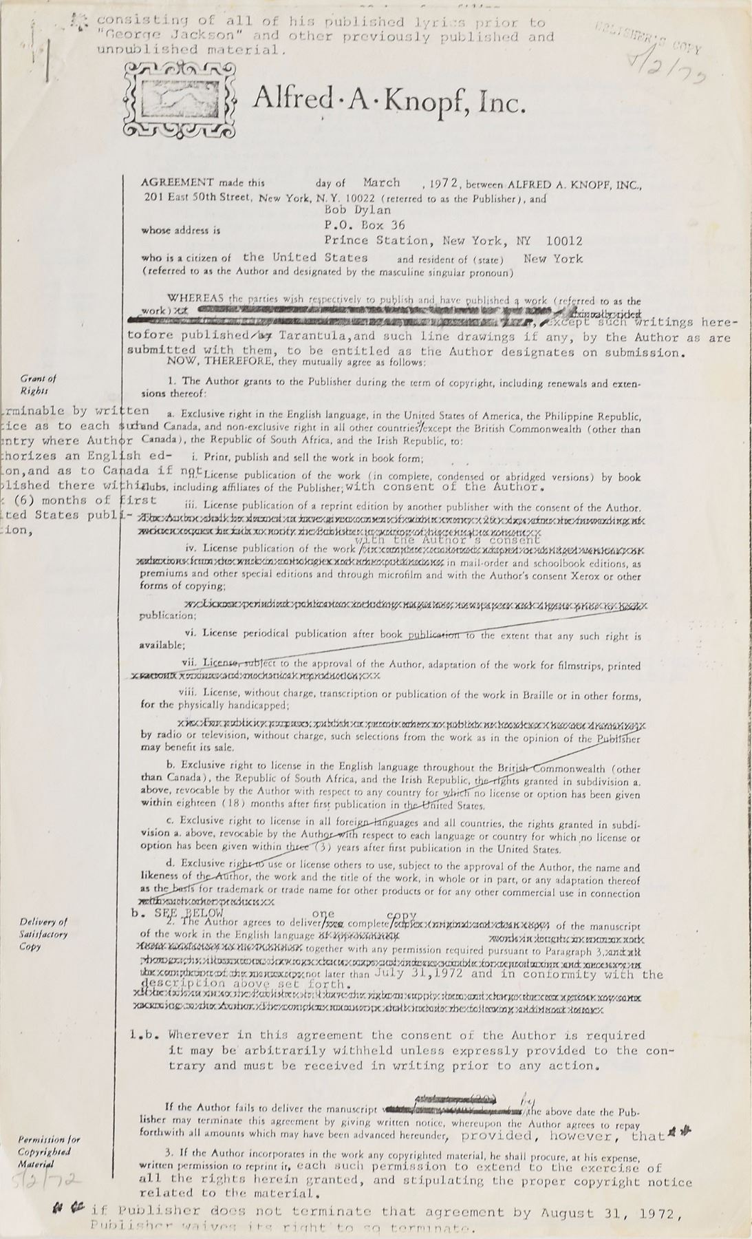 DS, two pages, 8.5 x 14, March 1972. Contract between Dylan and Alfred A. Knoff, Inc., in which the former grants the publisher exclusive right to print, publish, and sell the work entitled "Tarantula." Signed at the conclusion in black felt tip by Dylan. In fine condition, with expected document wear. Contracts signed by Dylan are seldom encountered; this example is made all the more desirable given that Tarantula was Dylan's first published book.