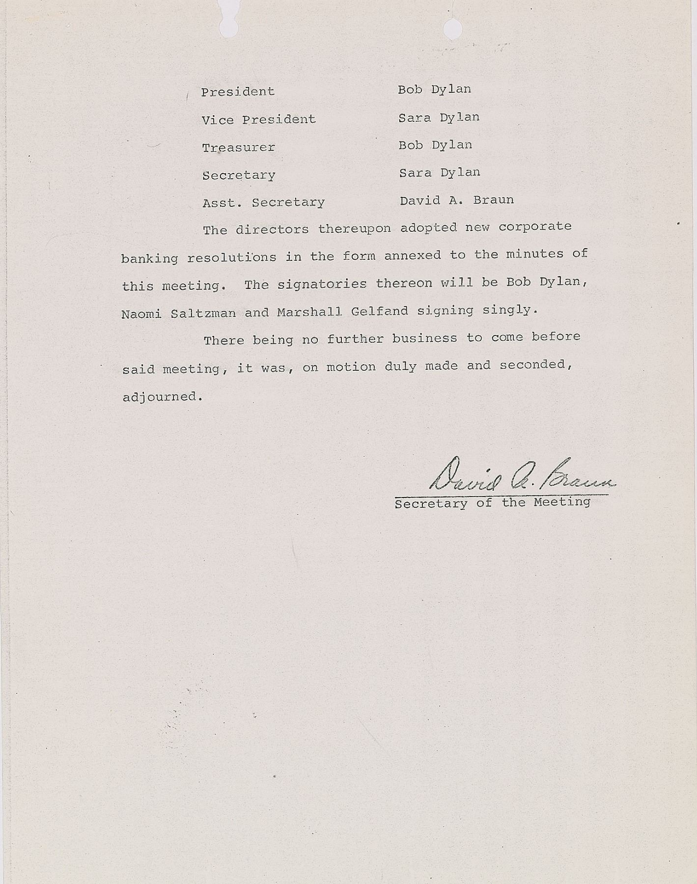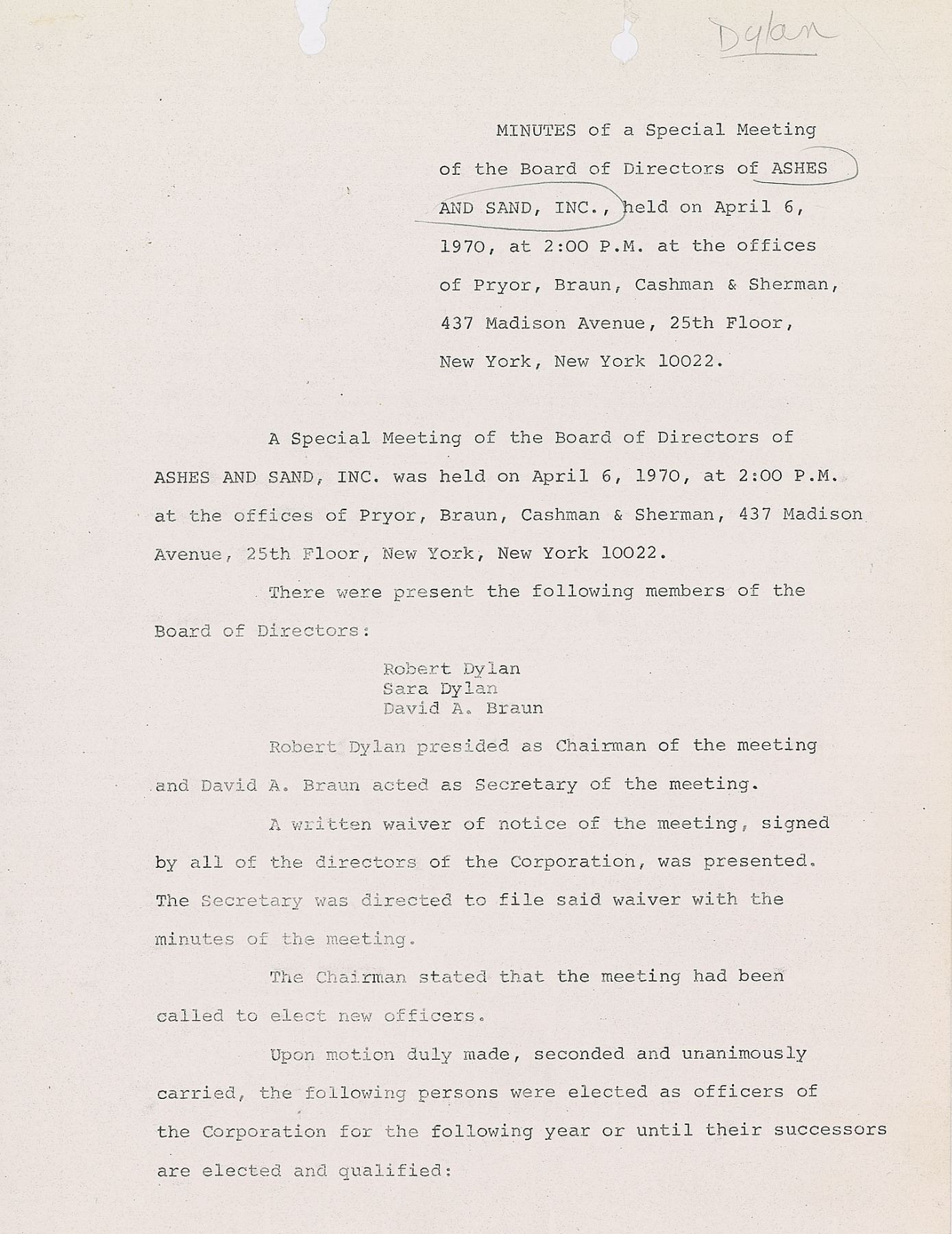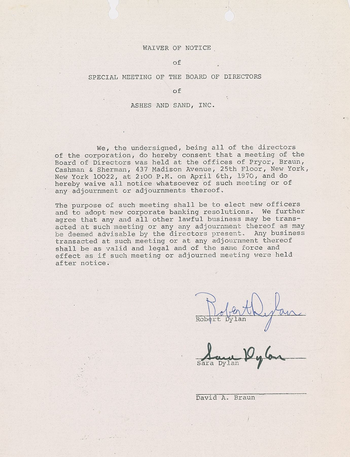 Rare DS, signed “Robert Dylan,” one page, 8.5 x 11, April 6, 1970. A "Waiver of Notice of Special Meeting of the Board of Directors of Ashes and Sand, Inc.," in part: "We, the undersigned, being all of the directors of the corporation, do hereby consent that a meeting of the Board of Directors was held…on April 8th, 1970…The purpose of such meeting shall be to elect new officers and to adopt new corporate banking resolutions." Signed at the conclusion in blue ballpoint by Bob Dylan and in black felt tip by his wife, Sara Dylan. Includes an original two-page copy of the meeting minutes. In fine condition. Ashes and Sand Inc. was the name of Dylan's touring company. His wife Sara is often cited as the inspiration for songs such as 'Sad Eyed Lady of the Lowlands,' 'Love Minus Zero/No Limit,' and 'Sara,' and Dylan's classic 1975 album Blood on the Tracks was inspired by the tension in their relationship. The pair divorced in 1977. A remarkable document and important association piece.