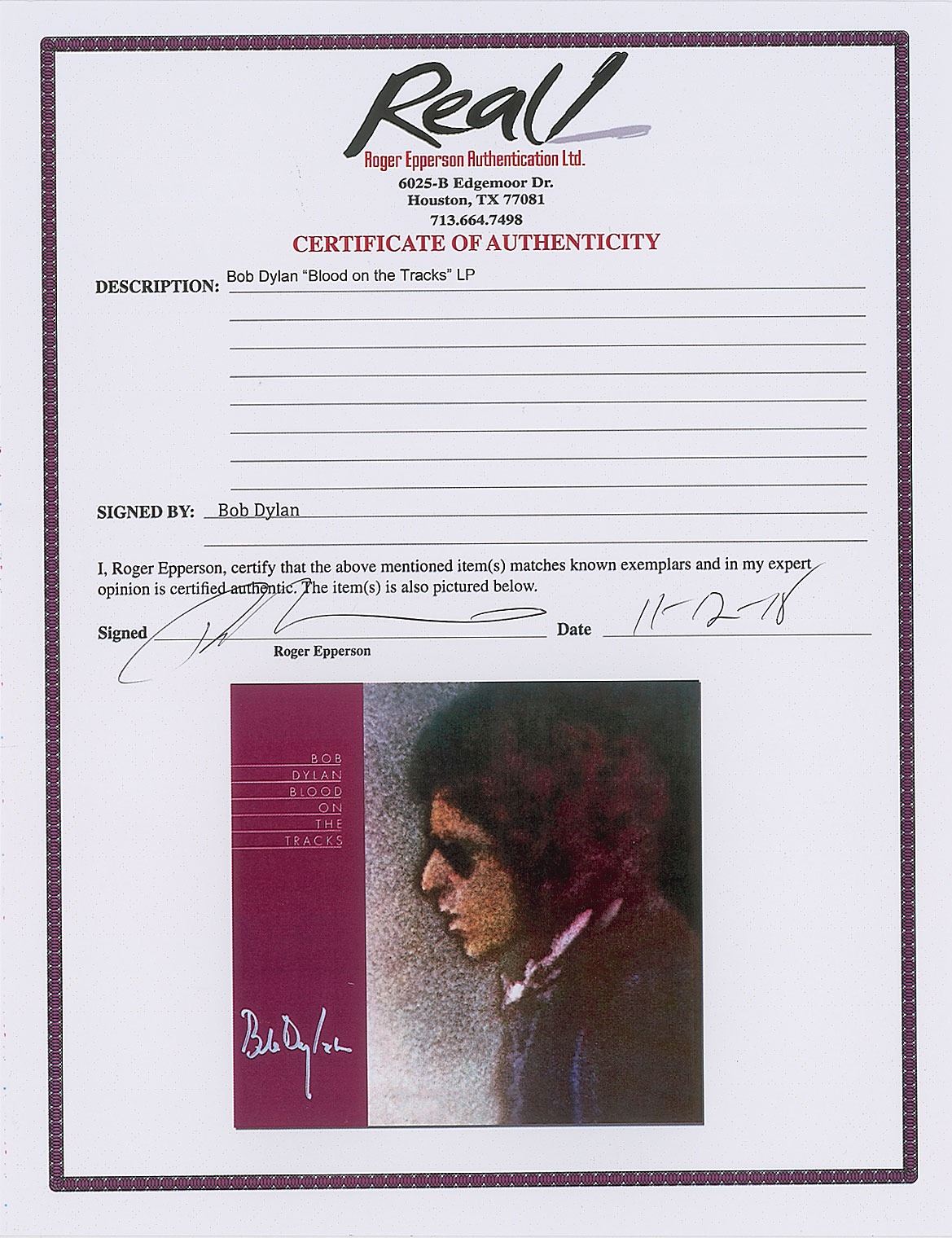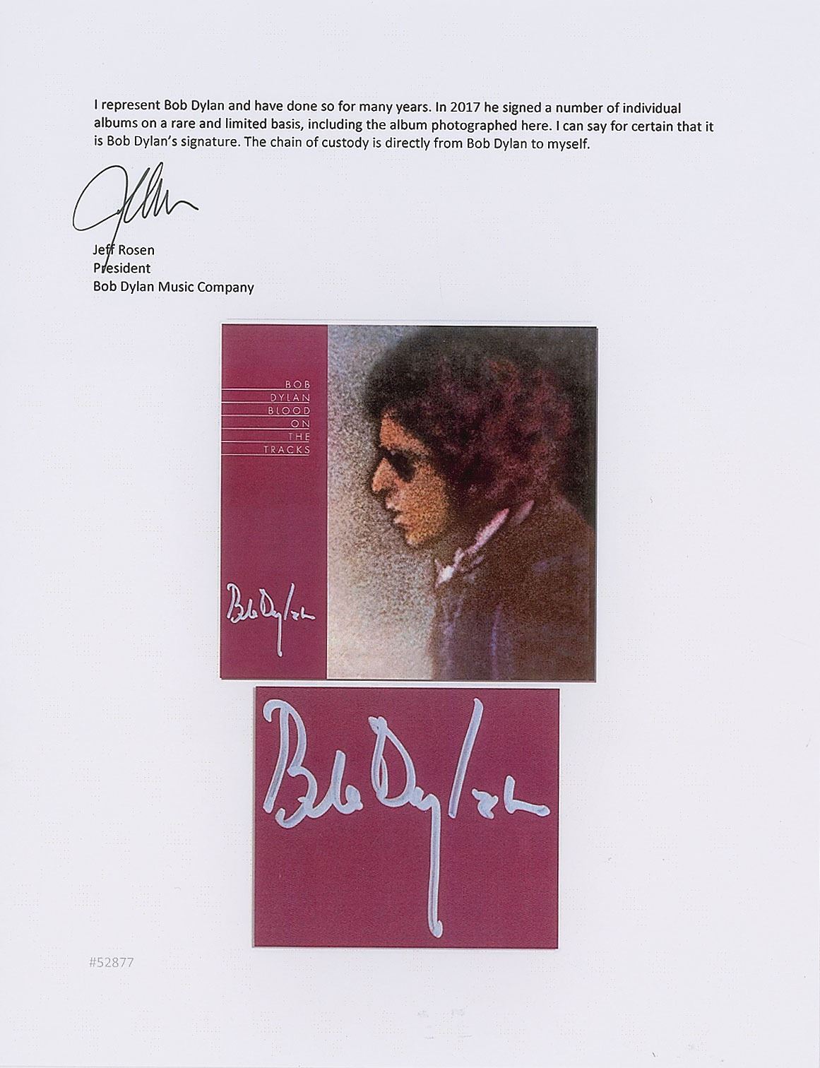 A spectacular example of Bob Dylan’s 15th studio album, Blood On The Tracks, signed perfectly by Dylan in silver ink. Accompanied by a full letter of authenticity from REAL and a letter of provenance from Jeff Rosen, president of the Bob Dylan Music Company, in full: "I represent Bob Dylan and have done so for many years. In 2017 he signed a number of individual albums on a rare and limited basis, including the album photographed here. I can say for certain that it is Bob Dylan's signature. The chain of custody is directly from Bob Dylan to myself." The album itself is from the personal stock of Jeff Rosen and Bob Dylan. The cover and original vinyl record are in mint condition.