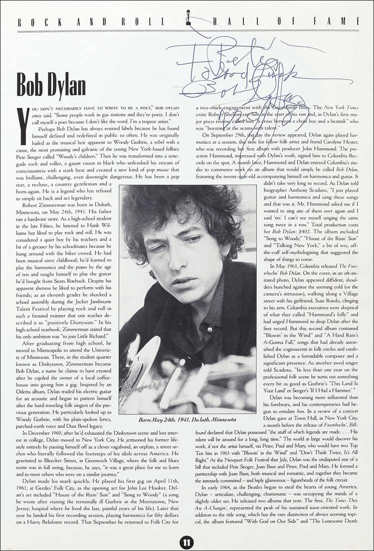 Program page from Dylan’s Rock and Roll Hall of Fame induction year, featuring a lengthy bio and a small image of Dylan strumming his guitar, signed and inscribed in blue ink, “To Pete, Good luck, Bob Dylan.” Double matted to an overall size of 12 x 16. In very fine condition. Pre-certified Roger Epperson/REAL and RRAuction COA.