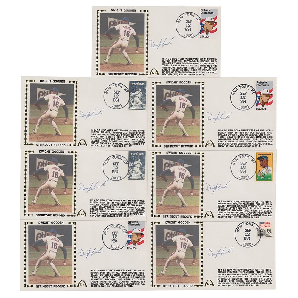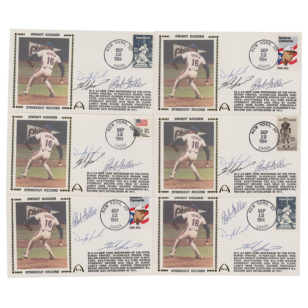 Six identical Gateway covers with silk color cachets honoring Doc Gooden's rookie strikeout record, all signed in ballpoint by Dwight Gooden, Bob Feller, and Herb Score. Also includes seven matching covers, signed by Gooden alone. In overall fine condition.