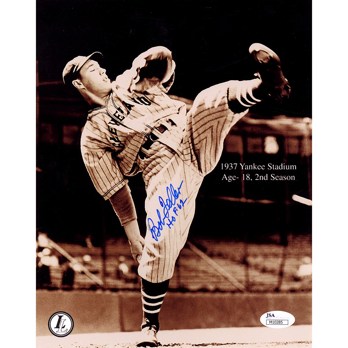 Bob Feller High Leg Kick Signed Sepia Engraved date and Age 8x10 Photo w/"HOF 62"Insc. ( JSA )