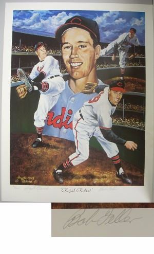 Bob Feller is the winningest pitcher in Cleveland Indians history. He has pitched three no-hitters, including the only Opening Day no-hitter. He was also 8-time All-Star and inducted into the Hall of Fame in 1962. Bob Feller has hand autographed this Cleveland Indians 18x24 Lithograph. Certificate of Authenticity from Athlon Sports. Close up of Pencil Signature shown at bottom.