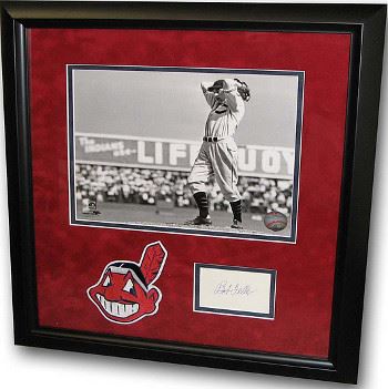Bob Feller is the winningest pitcher in Cleveland Indians history. He has pitched three no-hitters, including the only Opening Day no-hitter. He was also 8-time All-Star and inducted into the Hall of Fame in 1962. Bob Feller has hand autographed this index card, Custom Framed with Cleveland Indians 8x10 B&W Photo and Indians Patch to overall size of 18x16 . Certificate of Authenticity from Athlon Sports Collectibles.