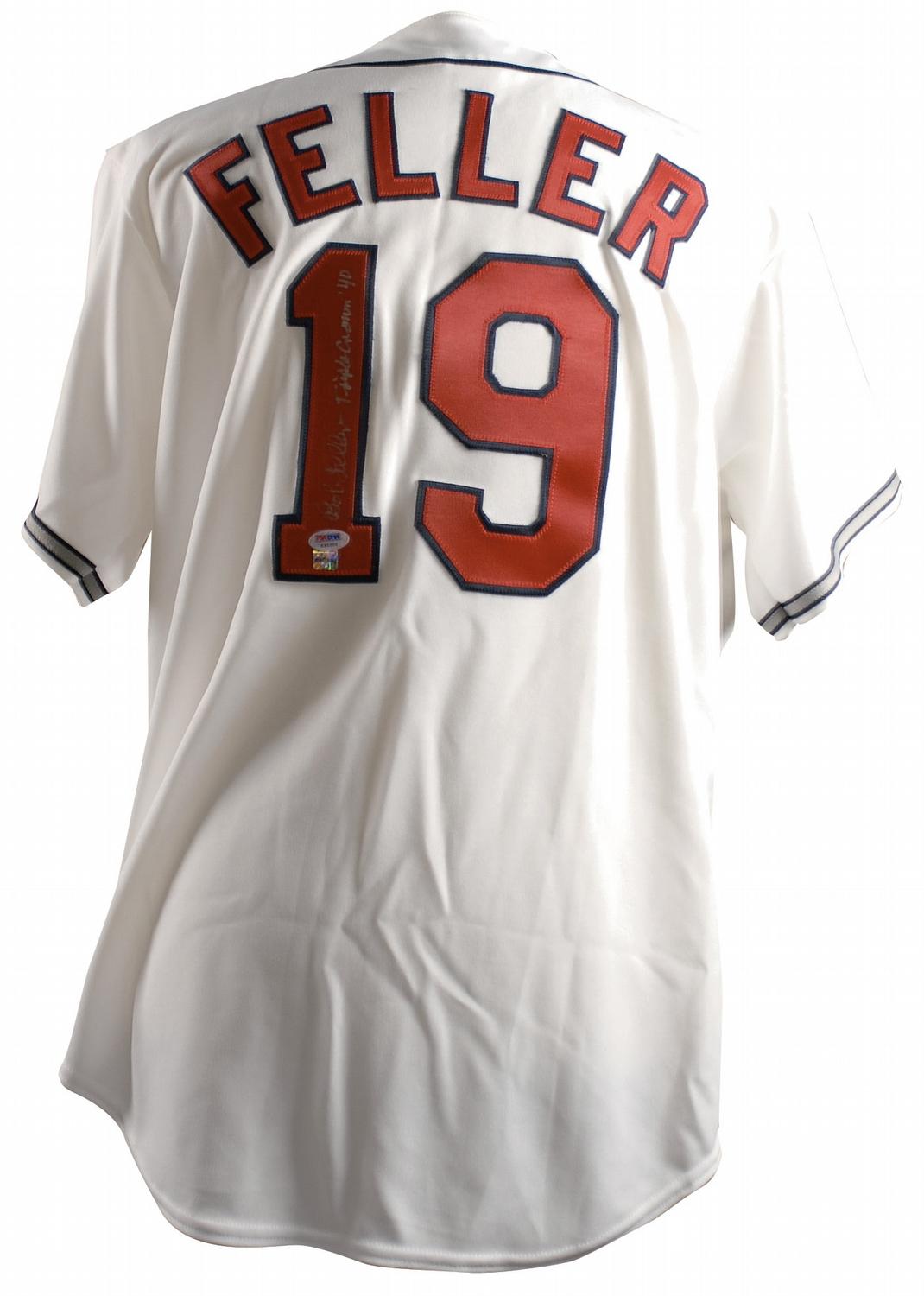Official Majestic replica Cleveland Indians baseball jersey, with sewn on letters and numbers, signed in silver ink on the number on the back, “Bob Feller Triple Crown ‘40.” In very fine condition with a PSA/DNA authentication label affixed and accompanied by a certificate of authenticity from PSA/DNA.