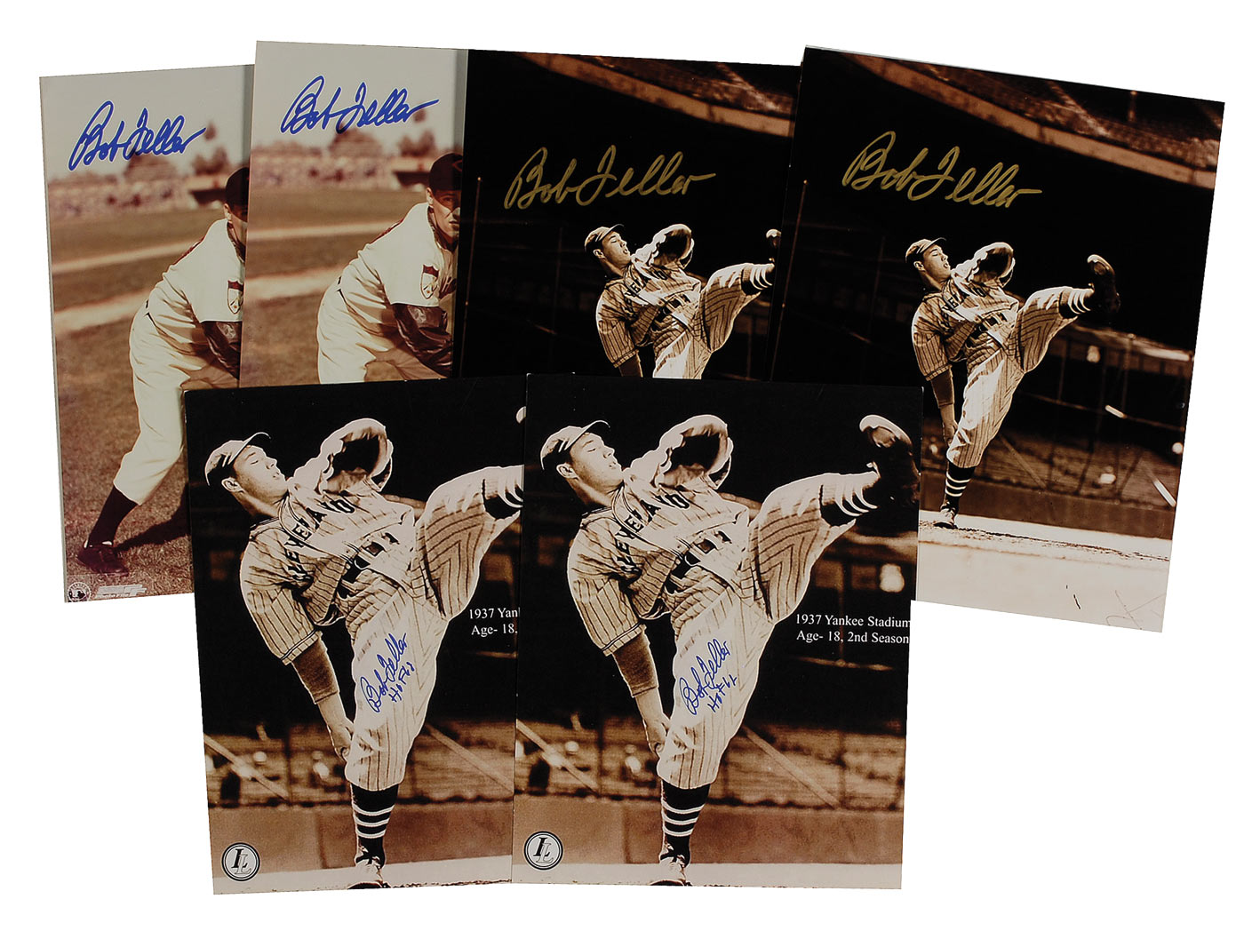 Six signed photos, four glossy 8 x 10 and two 7.25 x 9.25 cardstock, each signed in blue felt tip or gold ink by the Hall of Fame pitcher. In fine condition.