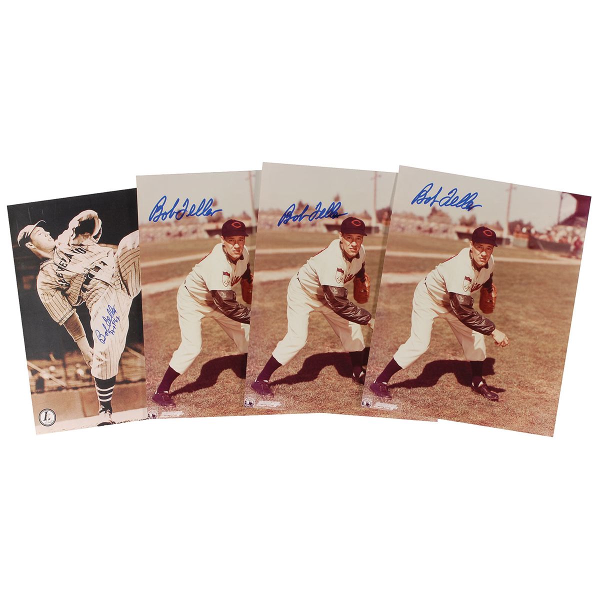 Four signed photos: three identical color glossy 8 x 10 photos, each signed in blue felt tip; and a 7.25 x 9.5 cardstock photo of Feller in his second season with the Yankees, signed in blue felt tip, “Bob Feller HOF 62.” In fine condition.