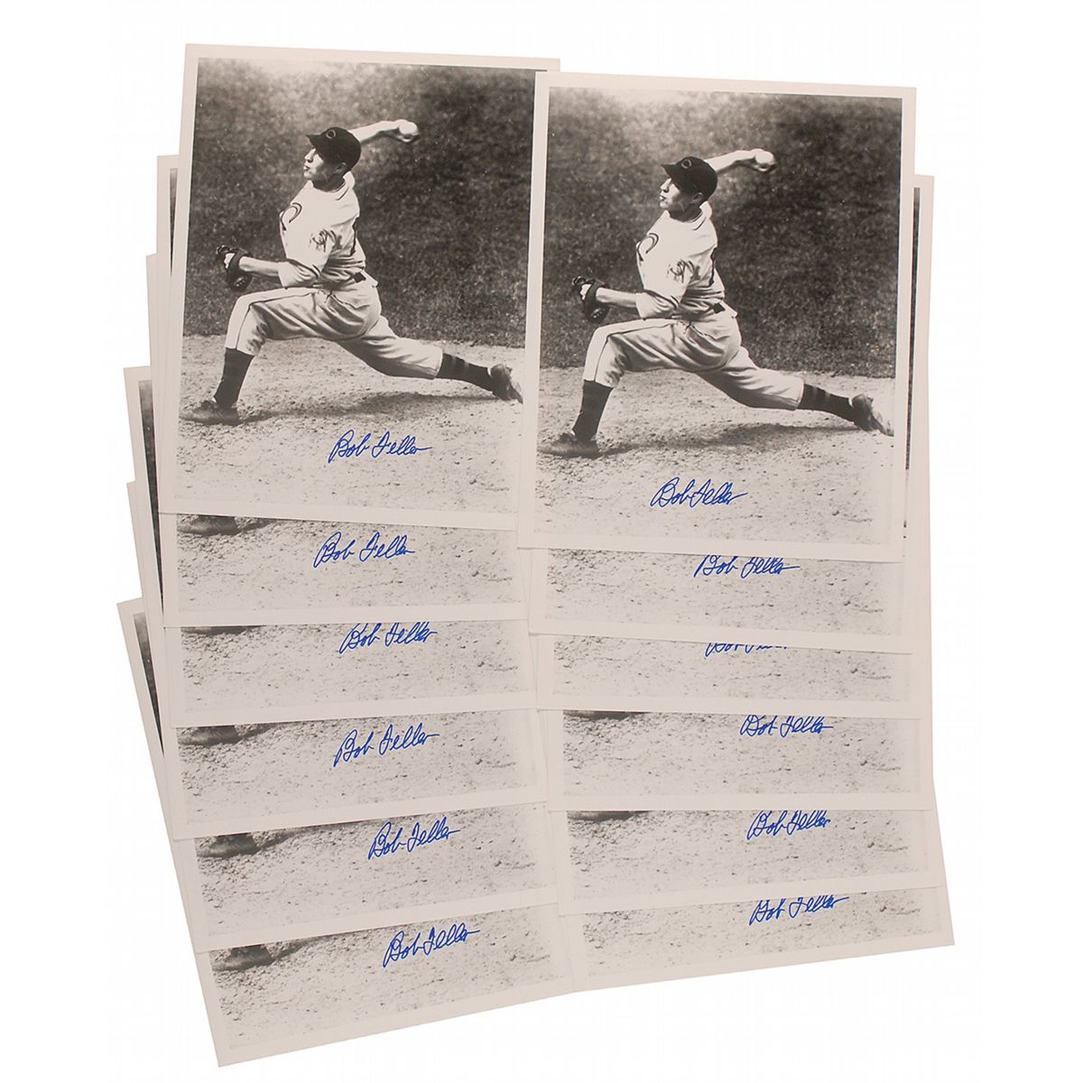Twelve identical glossy 8 x 10 photos of Feller mid-delivery, each signed in blue felt tip. In fine condition.