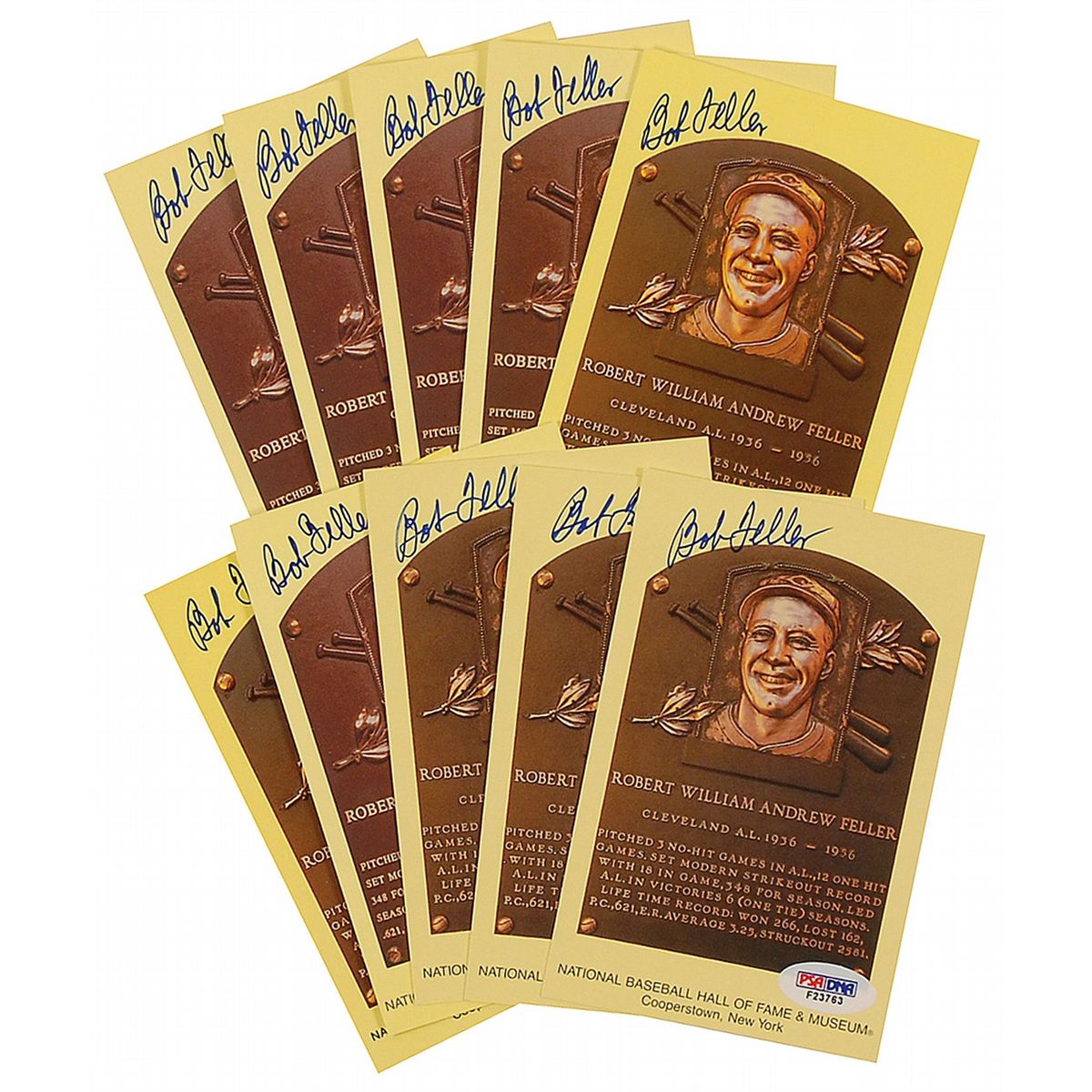 Ten gold Hall of Fame plaque cards, each signed at the top in blue felt tip. In fine condition, with a PSA/DNA authentication label affixed to lower right corner of each card.