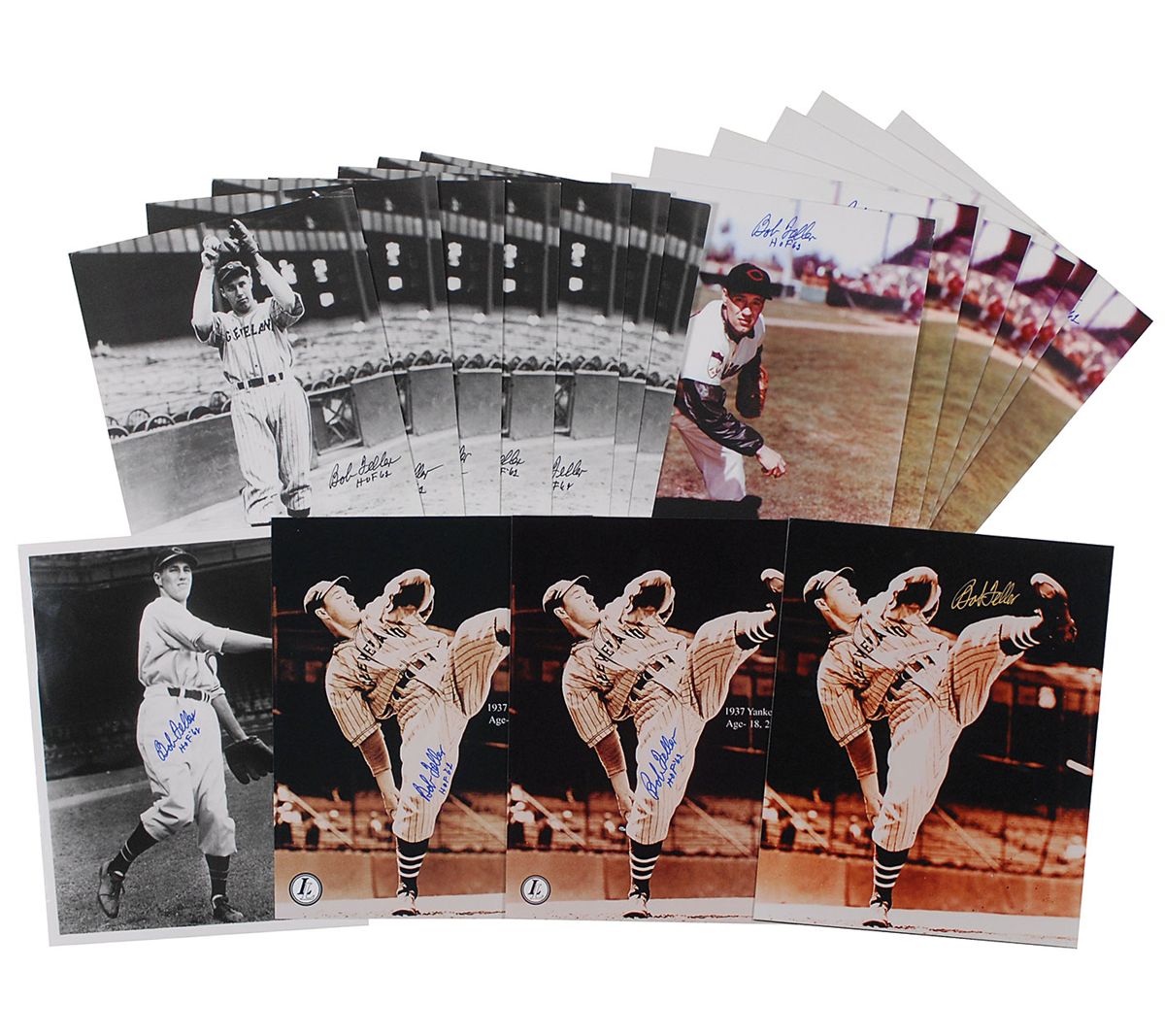 Collection of 17 photos of the great Cleveland pitcher in four different poses, various finishes, 7.25 x 9.75 to 8 x 10, each signed in felt tip or ink by Feller. In overall fine condition.