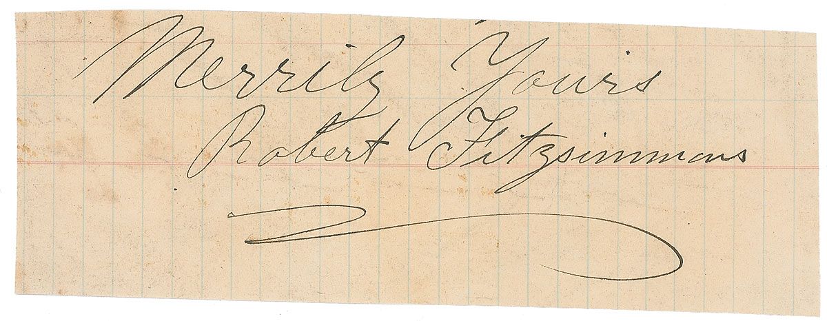 New Zealand boxer (1863–1917) who made boxing history as the sport's first three-division world champion. Scarce vintage fountain pen signature, “Merrily yours, Robert Fitzsimmons,” on an off-white, 6.75 x 2.5, lightly-lined clipped slip. In fine condition, with scattered foxing.