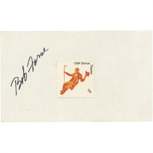 <B>Bob Fosse Autograph.</B></I> A 5" x 3" card, with a 13-cent commemorative postage stamp affixed, signed by the Academy Award-winning director/choreographer in black ink. Fosse's autograph extends along the left quadrant of the card and is large and clean. In Excellent condition though there is glue residue en verso from album storage (not affecting signature).<BR><BR><b>Shipping:</b> Flat Material, Small (<a target="_blank" href="http://www.heritageauctions.com/common/shipping.php">view shipping information</a>)