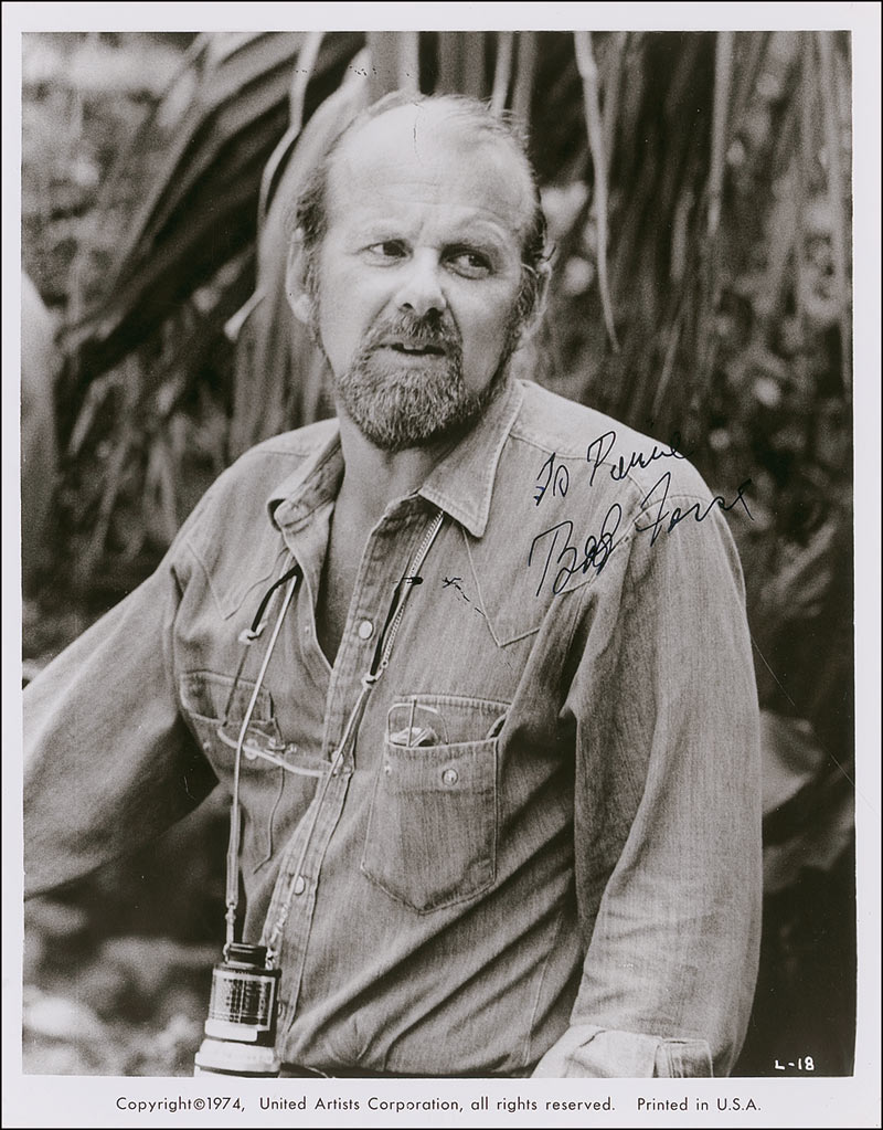 Glossy 8 x 10 United Artists publicity photo of Fosse from 1974, signed and inscribed in-person in black felt tip “To Pierre, Bob Fosse.” In fine condition, with some scattered light surface marks and impressions.