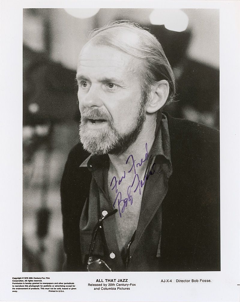 Glossy 8 x 10 20th Century Fox promotional photo for All That Jazz, signed and inscribed in blue felt tip “For Fred, Bob Fosse.” In fine condition, with some light surface marks and a paperclip impression on the left edge.