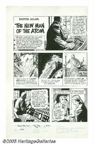 <B>Bob Fujitani - Doctor Solar, Man of the Atom #5, page 21 Original Art (Gold Key, 1969).</B></I> The diabolical machinations of the mysterious archcriminal known only as Nuro are put into play in this first page to this issue's third story, "The New Man of the Atom," which was written by Paul Newman. Comics great Bob Fujitani's work with <B>Doctor Solar</B></I> helped create one of the most distinctive and beloved superheroes of the atomic age! The image area measures 12" x 18" and, aside from one small glue stain between the fifth and sixth panels, the art is in Excellent condition.