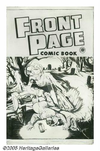 <B>Bob Fujitani - Front Page Comic Book #1 Cover Original Art (Harvey, 1945).</B></I> Offered here is a true piece of horror-history: one of the earliest supernatural/horror comic book covers art known to exist, from the one-shot <B>Front Page Comic Book</B></I> published by Harvey in 1945. This spooky scene spotlights a ghastly ghost rising from the grave to dispatch the petty thief that would steal her jewelry box. Bob Fujitani's expressive linework was always a treat, and looking at this chilling cover, it's easy to imagine his intricate feathering being an influence on horror-meister Bernie Wrightson. It's not always the case that a historic piece is also a top-notch work of art, but this cover certainly fits the bill -- it's a all-around winner! The image area of the art measures 14.25" x 21" and the art is in Very Good condition with a tiny chip out of the lower right corner and small tear in the lower margin. The title logo is a recent recreation.