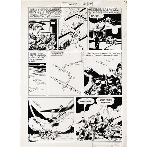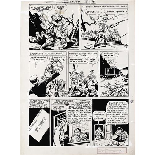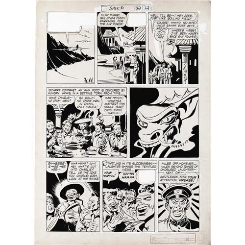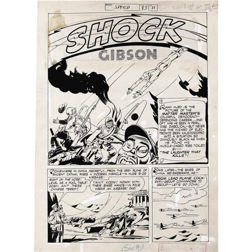 <B>Bob Fujitani - Speed Comics #43 Complete 8-page Story, "The Laughter That Kills" Original Art (Harvey, 1946).</B></I> Bob Fujitani's sinuous line adds real drama to this beautifully drawn Shock Gibson romp. His Golden Age work ranks alongside that of Joe Kubert, Mort Meskin, and Jerry Robinson. The image area of each page measures approximately 13" x 18" and the art is in Very Good condition. <BR><BR><B>Important notice:</B> Heritage usually auctions material at the rate of 200-250 lots per hour. On some occasions eBay Live bid software or the Internet may not be able to keep up with the pace of the auction. We recommend placing a realistic absentee bid now as insurance to avoid disappointment. Occasionally the auctioneer may eliminate or reject an eBay Live bid, and the auctioneer may also reopen a lot after the close of the eBay live bidding (usually because we missed an audience bid), and may reject your bid even if it shows you as the winning bidder. By bidding via eBay Live, you agree that Heritage may award the lot to another bidder at its sole discretion under the circumstances described above or any other reasonable circumstances. Since eBay bids are not shown to us until we open the lot on the floor, we treat those bids just like floor bids. In most cases the floor responds before the eBay bid is presented to us, due to Internet lag time, so for consistency we have made it a policy that floor bids are always considered first over tie eBay live bids. Also please note that all Heritage lots purchased through eBay Live carry a 22.5% Buyer's Premium. Please make sure you read the Terms and Conditions before you bid. This lot is being auctioned in conjunction with a live floor auction by Heritage Auction Galleries. All final auction and invoice information will be supplied by Heritage Auction Galleries, and all other information should be considered preliminary. Lot:41001 <BR><BR><B>Winning Notification and Billing:</B> After the FINAL session in this auction is complete, Heritage will send e-mail and snail mail invoices. This process normally takes several days. All final auction and invoice information will be supplied by Heritage Auction Galleries, and all other information should be considered preliminary. <BR><BR>This auction will be conducted on a live auction floor and over the Internet through eBay Live. If you choose to place an absentee bid, please take a moment to <font color='#0000ff'><u><a href='http://pages.ebay.com/liveauctions/help/before/laabsentee.html'>learn how eBay Live absentee bidding works</a></u></font><font color='#000000'>