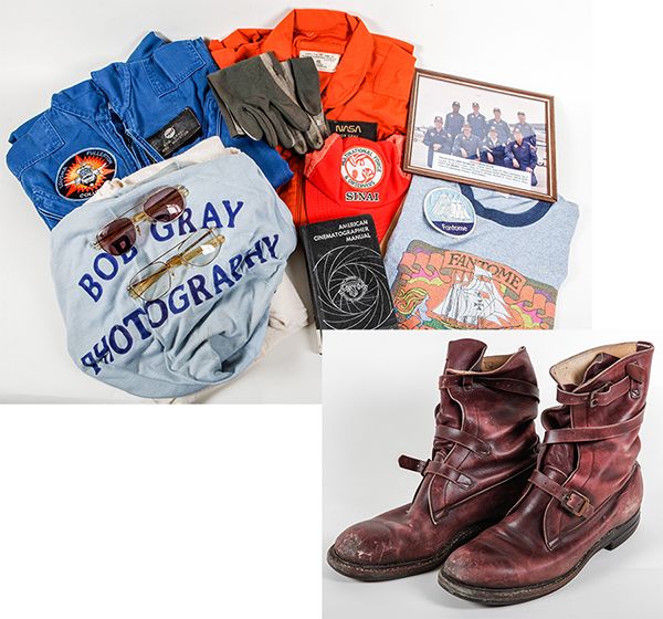 Bob Gary Collection – Flight Suits. Bob Gary was a senior NASA aerial instrumentation photographer from 1964 – 87. Gary was the lead chase TV aerial cameraman for the ALT program and for STS-2. The blue flight suit in this lot was what Gary used during this period. (Note; the Shuttle Chase Team Patch is one of the early versions with an error in the positioning of "Shuttle". This is one of only a few that remain after the original batch was destroyed.) He was also selected by NASA for a classified assignment with the Israeli Air Force doing aerial photography. The orange flight suit (42L), hat, glasses, boots and gloves were used for the Israeli mission and they do not contain any patches or other identifying markings except a name tag so his country of origin couldn’t be easily identified. Also, included is a team photograph of the STS-3 Chase team, an American Cinematographer Manual, a pair of sun glasses, t-shirt, etc. A very nice collection literally right out of Gary’s locker.