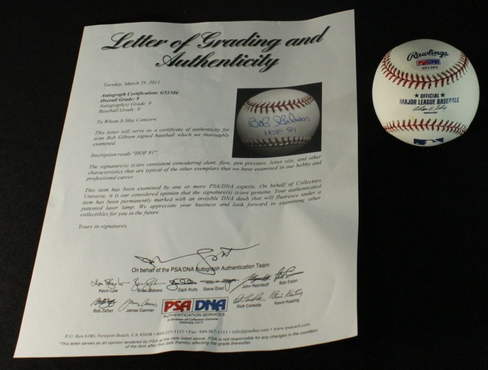 Official Major League Baseball. Hand-signed and inscribed in blue ink by Bob Gibson (Cardinals HOF). The autograph includes PSA/DNA hologram and matching LOA for authenticity purposes.