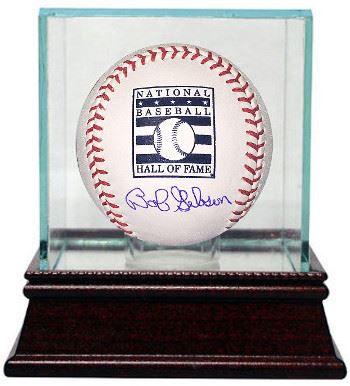 Bob Gibson played his entire professional career for the St. Louis Cardinals from 1959 to 1975. He was elected to the Baseball Hall of Fame in 1981. Gibson was a fierce competitor who rarely smiled and was known to throw brushback pitches to let batters know who was in charge. Revered by St. Louis baseball fans, Gibson dominated with his fastball, sharp slider and a slow, looping curveball. Bob Gibson has hand signed this Official Hall of Fame Logo Major League Baseball. MLB Hologram and Certificate of Authenticity. Glass Display Case shown IS included.