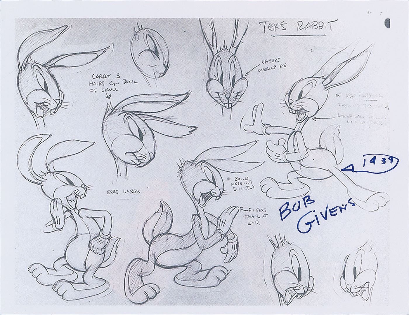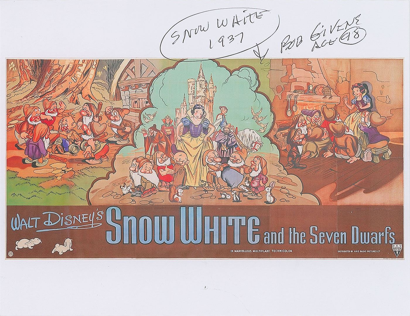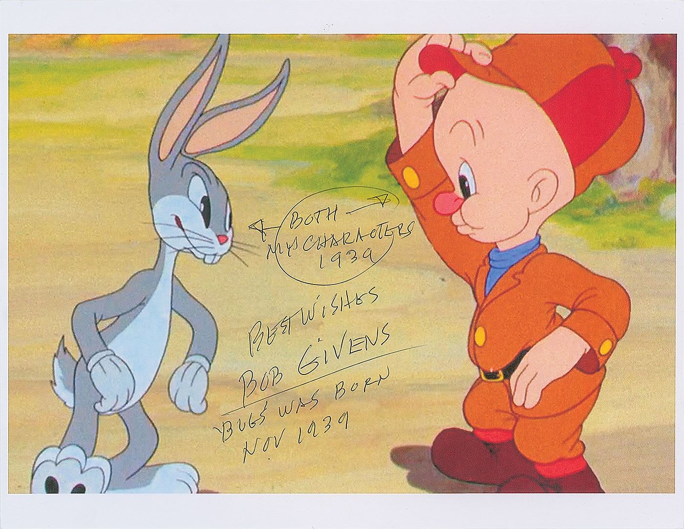 Set of three 8.5 x 11 laserprint photos of characters animated by Bob Givens, including: a Bugs Bunny character sheet, signed in blue felt tip, "Bob Givens, 1939"; Bugs Bunny standing with Elmer Fudd, signed in black ink, "Best wishes, Bob Givens, 'Bugs' was born Nov 1939," with Givens adding in a hand-drawn circle above, "Both my characters, 1939"; and an image of a huge 24-sheet movie poster for the 1937 film Snow White and the Seven Dwarfs, signed in black ink, "Bob GIvens, Age 98," who adds in a hand-drawn circle, "Snow White 1937." In overall very fine condition.