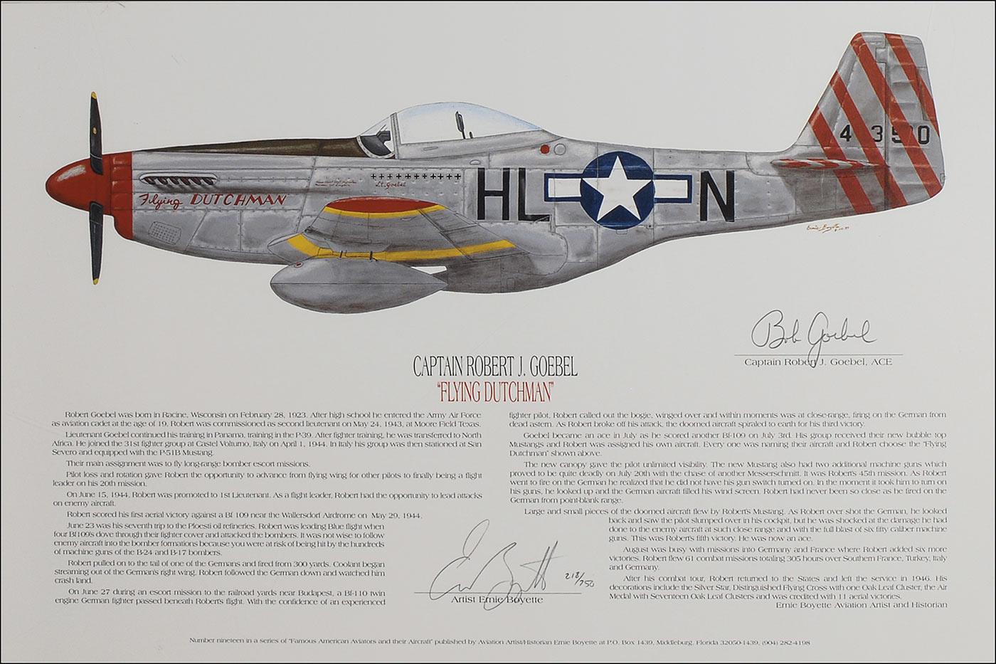 Color limited edition 18 x 12 lithograph entitled ‘Flying Dutchman,’ numbered #218/750, signed in pencil by the aircraft’s pilot, Bob Goebel. Also signed in pencil by the artist, Ernie Boyette. Rolled and in fine condition.