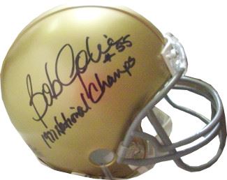 Bob Golic received an athletic scholarship to attend the University of Notre Dame, where he played for the Notre Dame Fighting Irish football team from 1975 to 1978. He was selected as a first-team All-American for the 1977, and a unanimous first-team All-American in 1978. He was also a member of the 1977 NCAA National Champion football team. Bob Golic has hand signed this Notre Dame Fighting Irish Mini Helmet with 1977 National Champs inscription. MAB Hologram and Certificate of Authenticity from Athlon Sports.