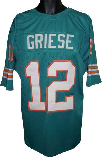 Bob Griese was drafted in 1967 by the Miami Dolphins. Griese led the Dolphins to three consecutive Super Bowl appearances, including two Super Bowl victories (VII and VIII). Griese's talents eventually resulted in his induction to the College Football Hall of Fame and the Indiana Football Hall of Fame in 1984 and the Pro Football Hall of Fame in 1990. Don Shula is best known as coach of the Miami Dolphins, the team he led to two Super Bowl victories, and to the National Football League's only perfect season. Shula was named 1993 Sportsman of the Year by Sports Illustrated. This is a Bob Griese Miami Dolphins unsigned Teal TB unlicensed custom-prostyle jersey with twill stitched nameplate and numbers. perfect for autograph or to wear! Size XL