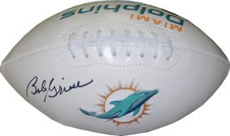 Bob Griese was drafted in 1967 by the Miami Dolphins. Griese led the Dolphins to three consecutive Super Bowl appearances, including two Super Bowl victories (VII and VIII). Griese's talents eventually resulted in his induction to the College Football Hall of Fame and the Indiana Football Hall of Fame in 1984 and the Pro Football Hall of Fame in 1990. Bob Griese has hand autographed this Miami Dolphins Logo Football. MAB Hologram and Certificate of Authenticity from Athlon Sports.