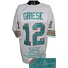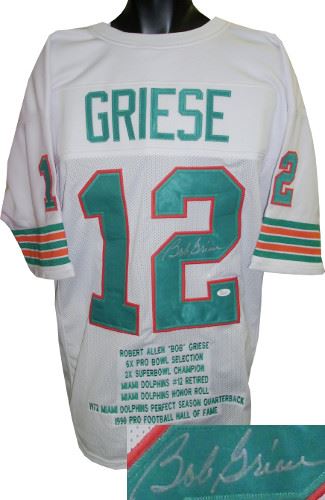 Bob Griese was drafted in 1967 by the Miami Dolphins. Griese led the Dolphins to three consecutive Super Bowl appearances, including two Super Bowl victories (VII and VIII). Griese's talents eventually resulted in his induction to the College Football Hall of Fame and the Indiana Football Hall of Fame in 1984 and the Pro Football Hall of Fame in 1990. Bob Griese has hand autographed this Miami Dolphins White Prostyle Jersey with Embroidered Stats Inscription. JSA Hologram and Certificate of Authenticity.