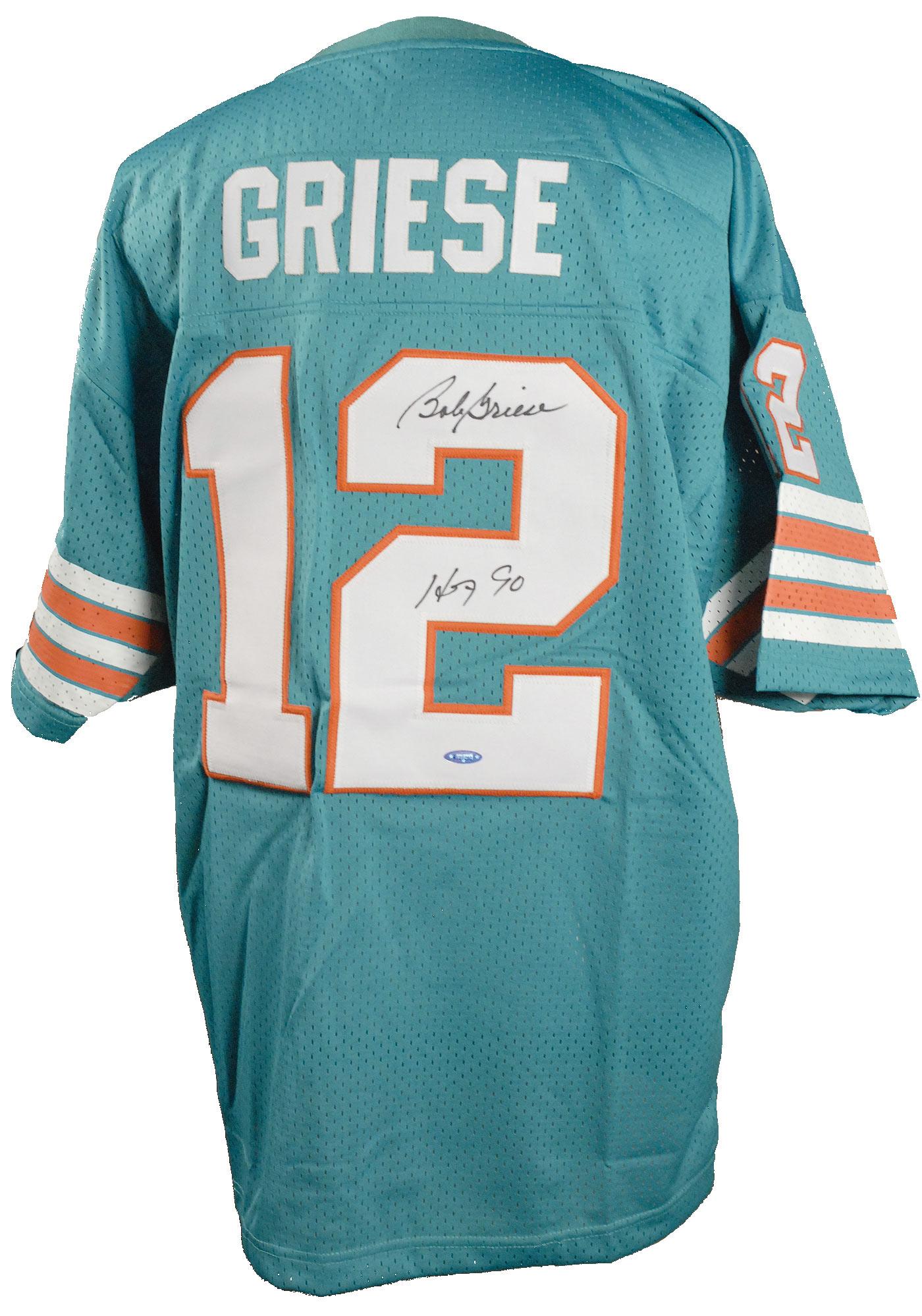 Replica Miami Dolphins football jersey, with sewn on letters and numbers, signed in felt tip on the number on the back, “Bob Griese HOF 90.” In fine condition. Accompanied by a certificate of authenticity from Tristar.