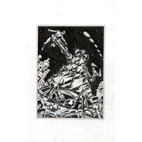 <B>Bob Hall - Magnus Robot Fighter Trading Card Illustration Original Art (undated).</B></I> When artist Russ Manning heard that editor Craig Chase wanted him to work on a new book set in the year 4000 A.D., he leapt at the chance to get away from licensed books and to write and draw his own creation. His brainchild was <B>Magnus Robot Fighter 4000 A.D.</B></I>, one of the few science fiction based comics success stories of the 60s. The 1990s saw the return of <B>Magnus</B></I> when Valiant Comics offered up all new tales based on the character. This Bob Hall illustration was created for an unidentified trading card, and features the Harbringer facing down a three-story metal monstrosity. The image area measures 8" x 11" and the work is in Excellent condition.
