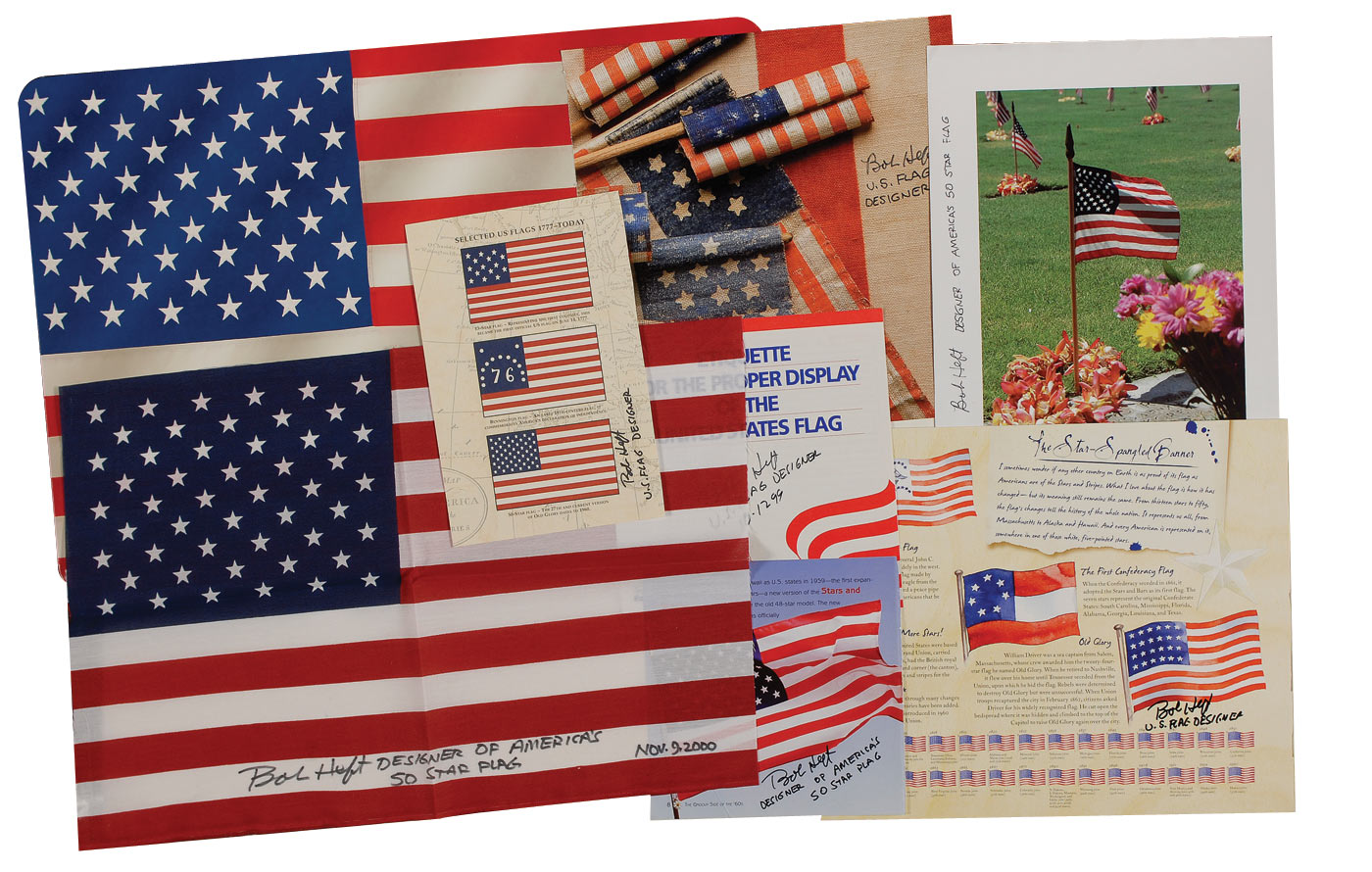 Eight items: fabric flag, 17.5 x 12, signed on the final white stripe in black felt tip “Bob Heft, Designer of America’s 50 Star Flag, Nov. 9, 2000”; greeting card, 19 x 13, signed on the front cover in black felt tip “Bob Heft, Designer of America’s 50 Star Flag”; and six flag-related pages or brochures, each signed in black felt tip by Heft who has added his role as designer to each. In overall fine condition, with irregularly trimmed edges to the flag and a few creases to the pages. Accompanied by a memorial card from Heft’s funeral service.
