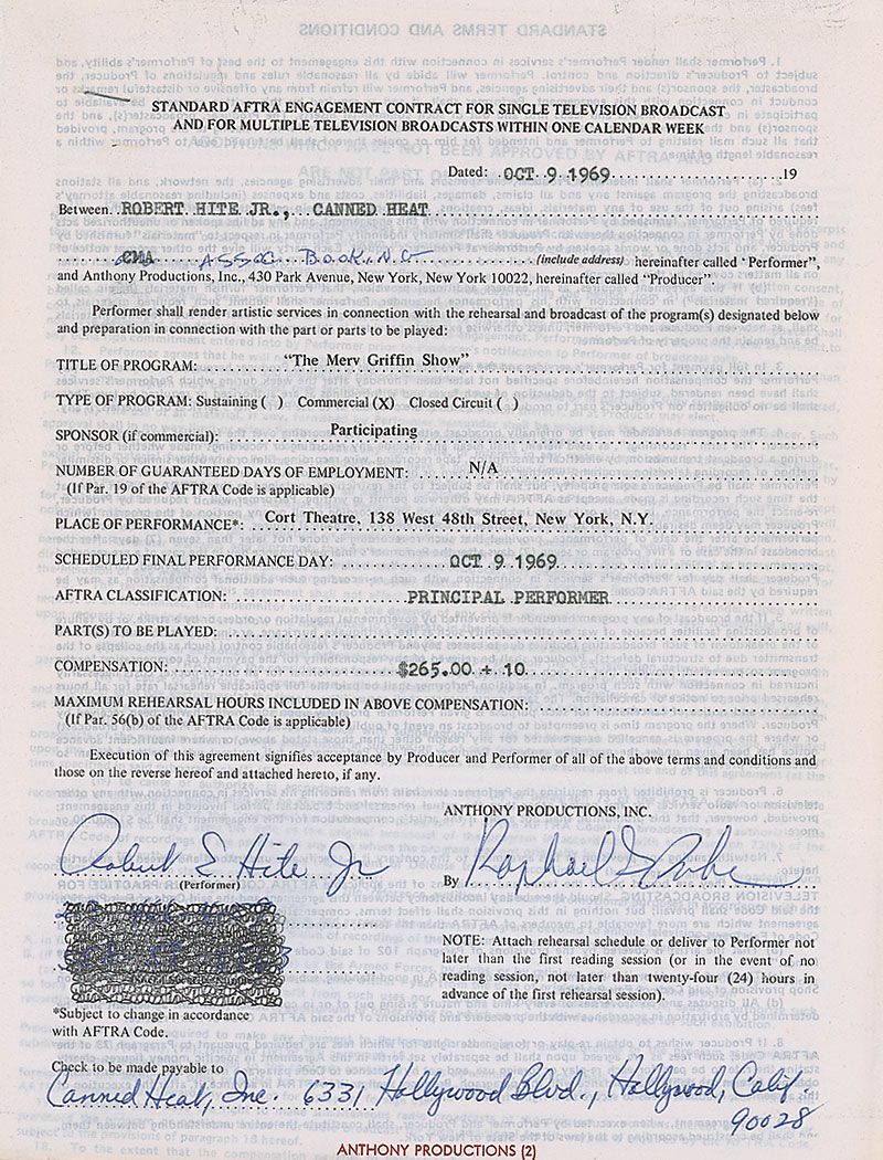 Co-founder of blues-rock band Canned Heat (1943–1981), nicknamed ‘Bear’ because of his large size; he died of a heart attack at age 38. Scarce DS, one page, 8.5 x 11, October 9, 1969. Standard AFTRA contract in which Hite agrees to appear on The Merv Griffin Show on the same day in exchange for $265 plus a 10% agency commission. Signed at the conclusion in ballpoint by Hite, “Robert E. Hite, Jr.,” adding the address for Canned Heat. A standard AFTRA rider is stapled to the main document in the upper left. In fine condition, with expected document wear.