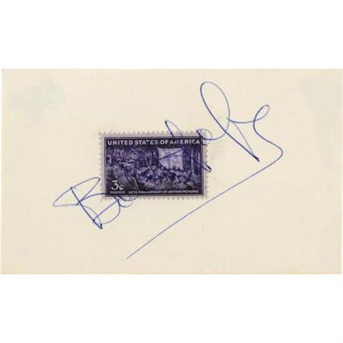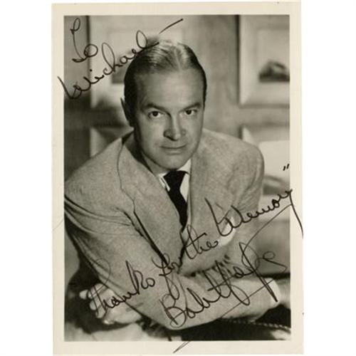 <B>Bob Hope Autographs.</B></I> A 5" x 3" card, with a three-cent commemorative postage stamp affixed, signed by Bob Hope in blue ink. His autograph extends across the face of the stamp and is large and clean. Accompanied by a 5" x 7" b&w photograph also signed by Hope in black ink. In Excellent condition though the card has minor glue residue from album storage en verso (not affecting signature).<BR><BR><b>Shipping:</b> Flat Material, Small (<a target="_blank" href="http://www.heritageauctions.com/common/shipping.php">view shipping information</a>)