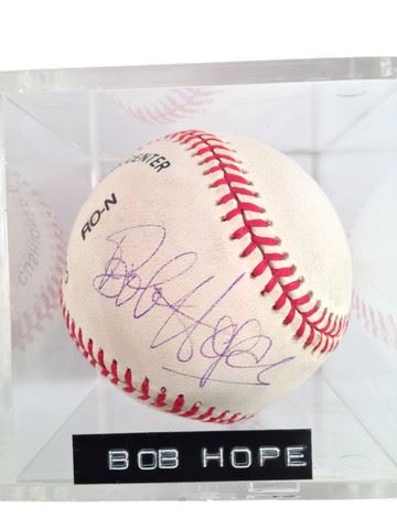 Bob Hope signed baseball in plastic display case (3"x3"). Known for his stand up comedy and acting, mainly for his comedy for US Military Troops.