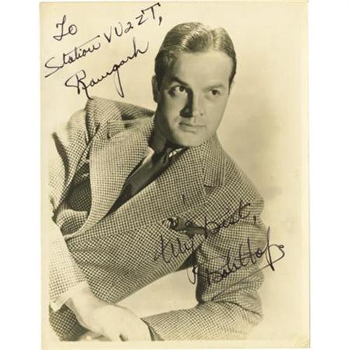 <B>Bob Hope Signed Photo.</B></I> A b&w 8" x 10" photo of the comedic actor, inscribed and signed by him in black ink. In Very Fine condition.<BR><BR><b>Shipping:</b> Flat Material, Small (<a target="_blank" href="http://www.heritageauctions.com/common/shipping.php">view shipping information</a>)