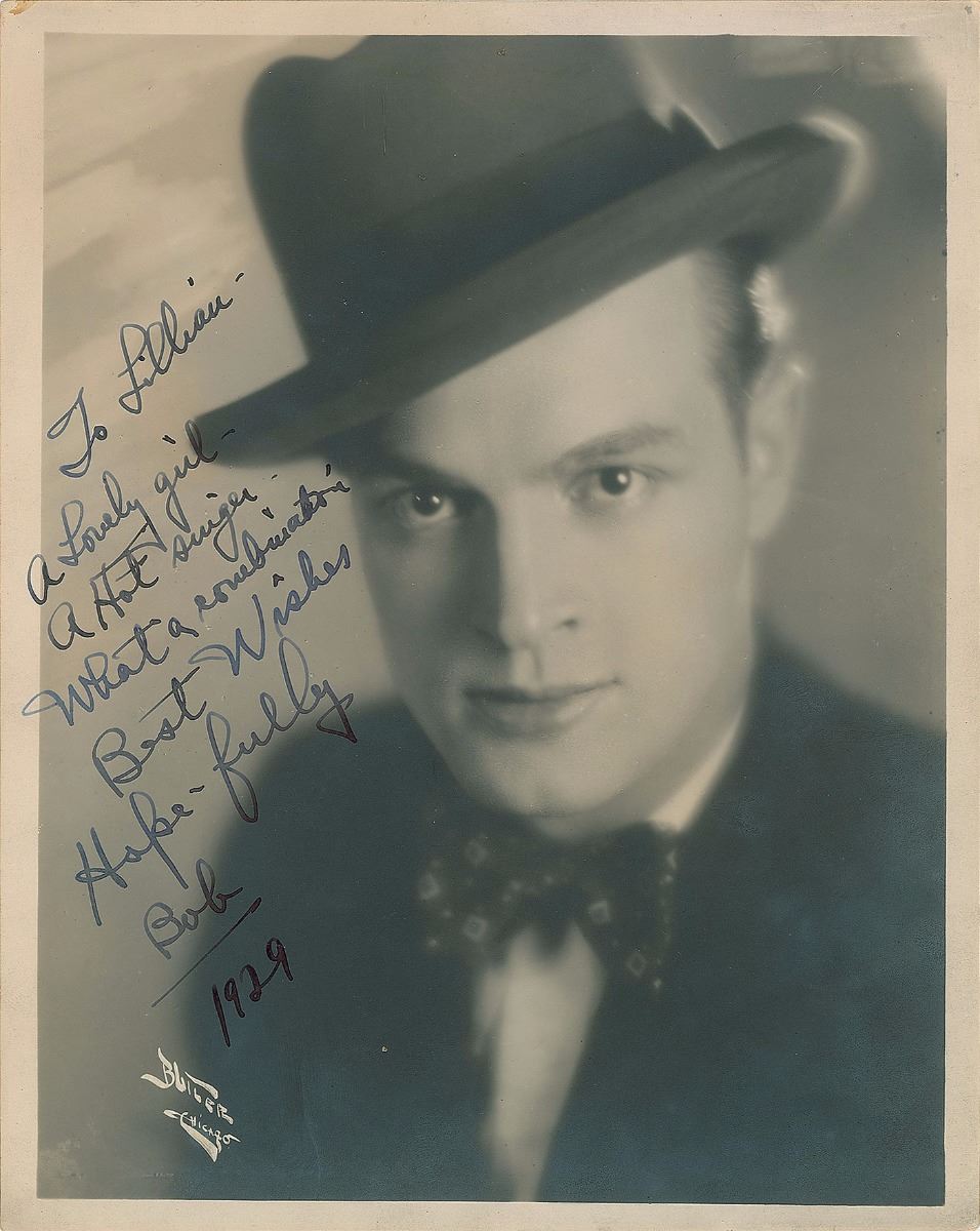 Terrific vintage matte-finish 8 x 10 portrait of the 26-year-old entertainer by Butler of Chicago, signed and inscribed in fountain pen, “To Lillian—A lovely girl—A hot singer—What a combination, Best Wishes, Hope-fully, Bob, 1929.” In fine condition, with faint silvering to the darker areas. A wonderful early pose of the American icon only a few years into his vaudevillian career.