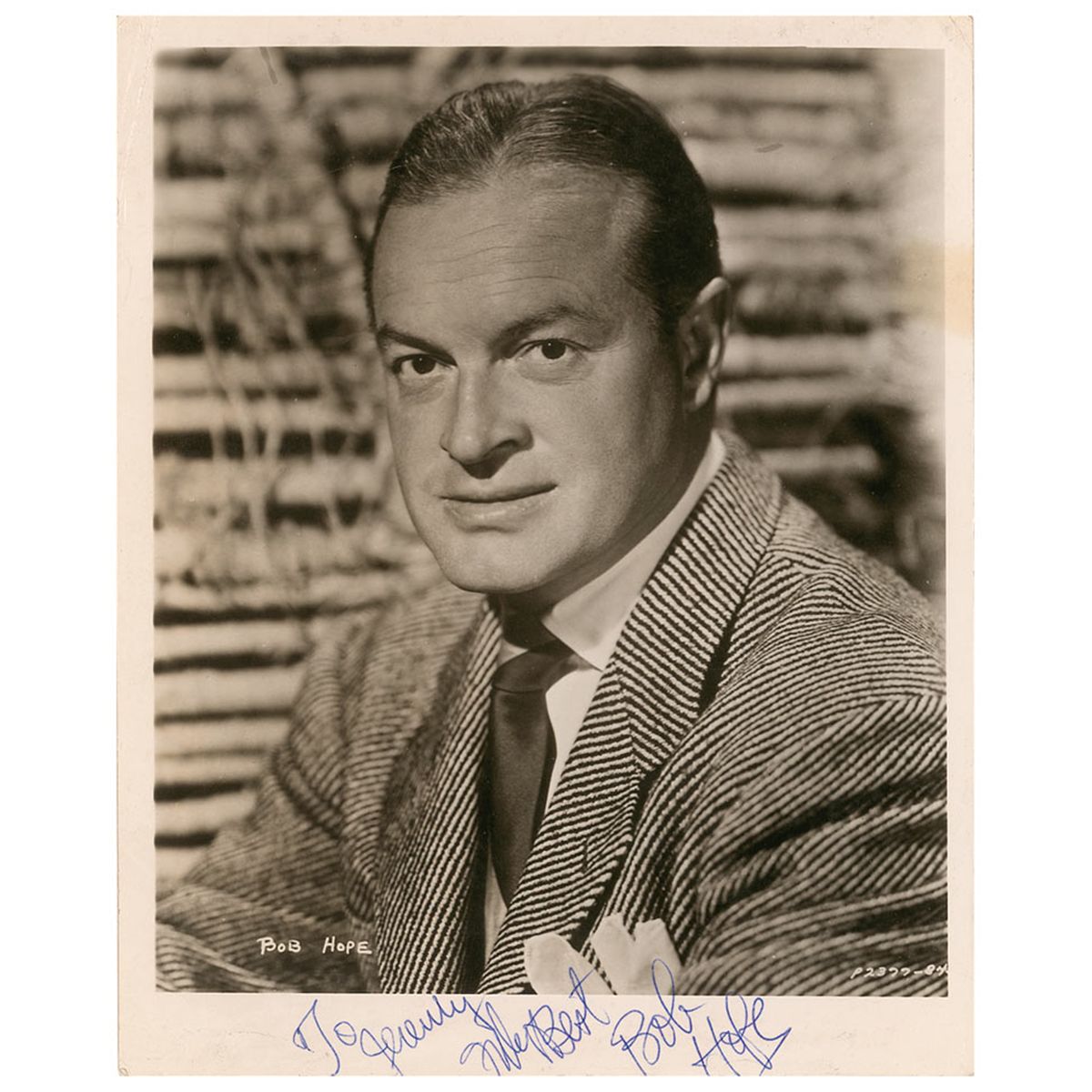 Vintage glossy 8 x 10 head-and-shoulders photo of a young Hope, signed and inscribed in the bottom border in blue ballpoint, “To Jeremy, My Best, Bob Hope.” In very good condition, with scattered light surface creasing, with some more moderate creasing to the corners, a small spot of toning to the right edge, and scattered light soiling along the top edge.