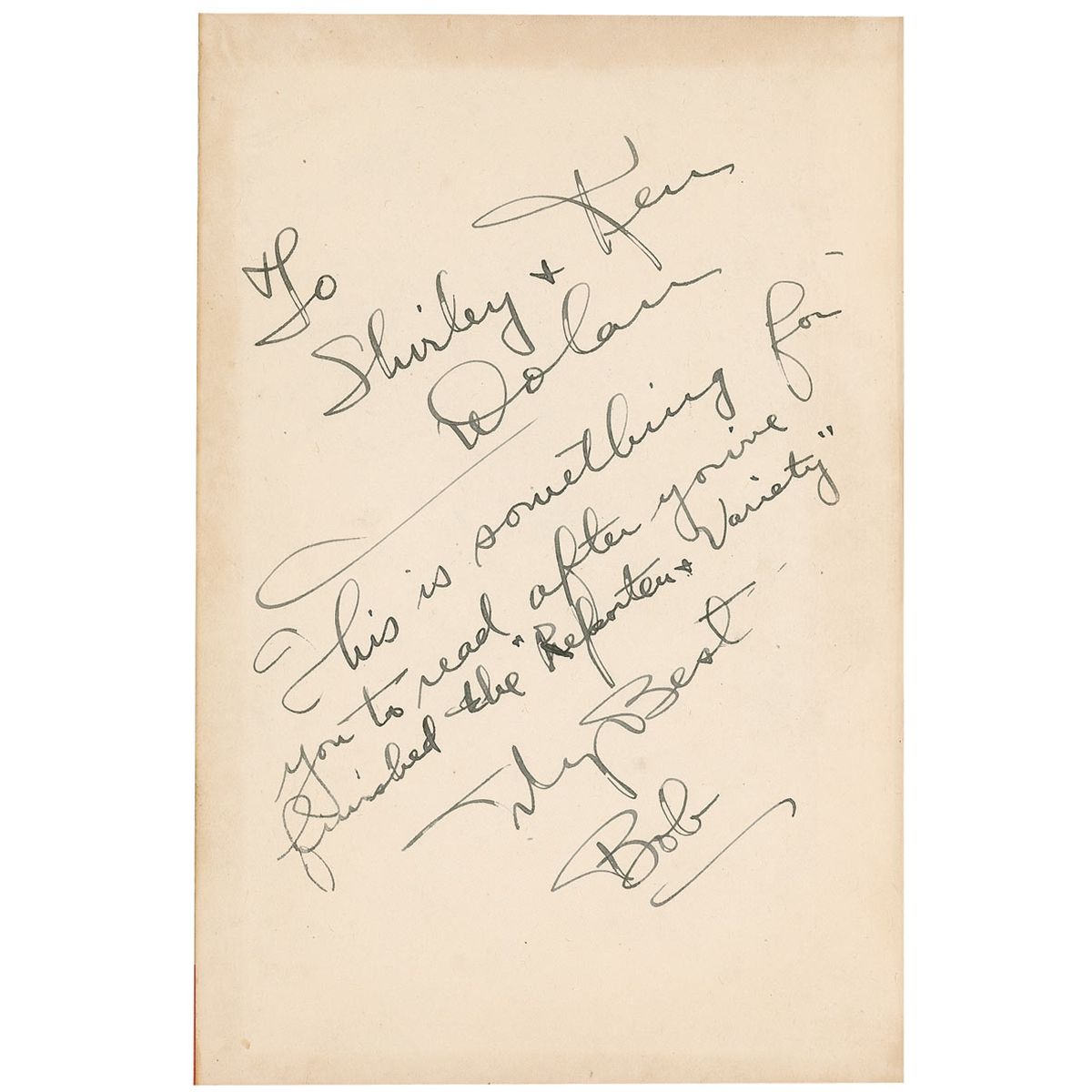 Signed book: They Got Me Covered. First edition. Hollywood, California: Bob Hope, 1941. Hardcover, 5.25 x 8, 95 pages. Signed and inscribed in fountain pen on the front pastedown, “To Shirley & Ken Dolan, This is something for you to read after you’ve finished the ‘Reporter & Variety.’ My Best, Bob.” In very good condition, with scattered moderate toning to the signature page and the first and last free end pages, loose, but intact hinge, mild wear and rubbing to the cover.