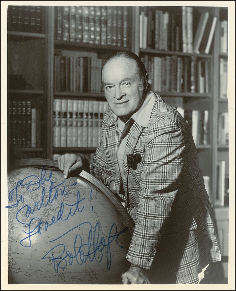 Glossy 8 x 10 photo of Hope posing with a large globe, signed and inscribed in blue felt tip “To the Carlton—Loved it! Bob Hope.” In fine condition.