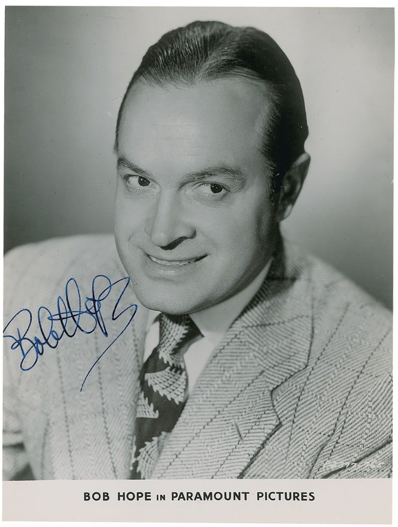 Vintage glossy 7.25 x 9.75 head-and-shoulders photo of Hope grinning, boldly signed in blue ink. In fine condition, with trimmed edges, affecting the very beginning of the first letter of signature, overall light creases and surface impressions, and light curling to vertical edges.
