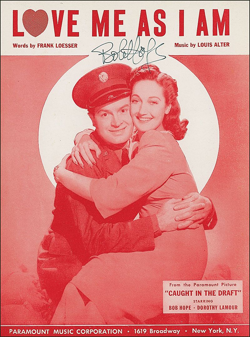 Vintage pictorial sheet music for the song “Love Me As I Am,” signed later in black felt tip “Bob Hope.” In fine condition.