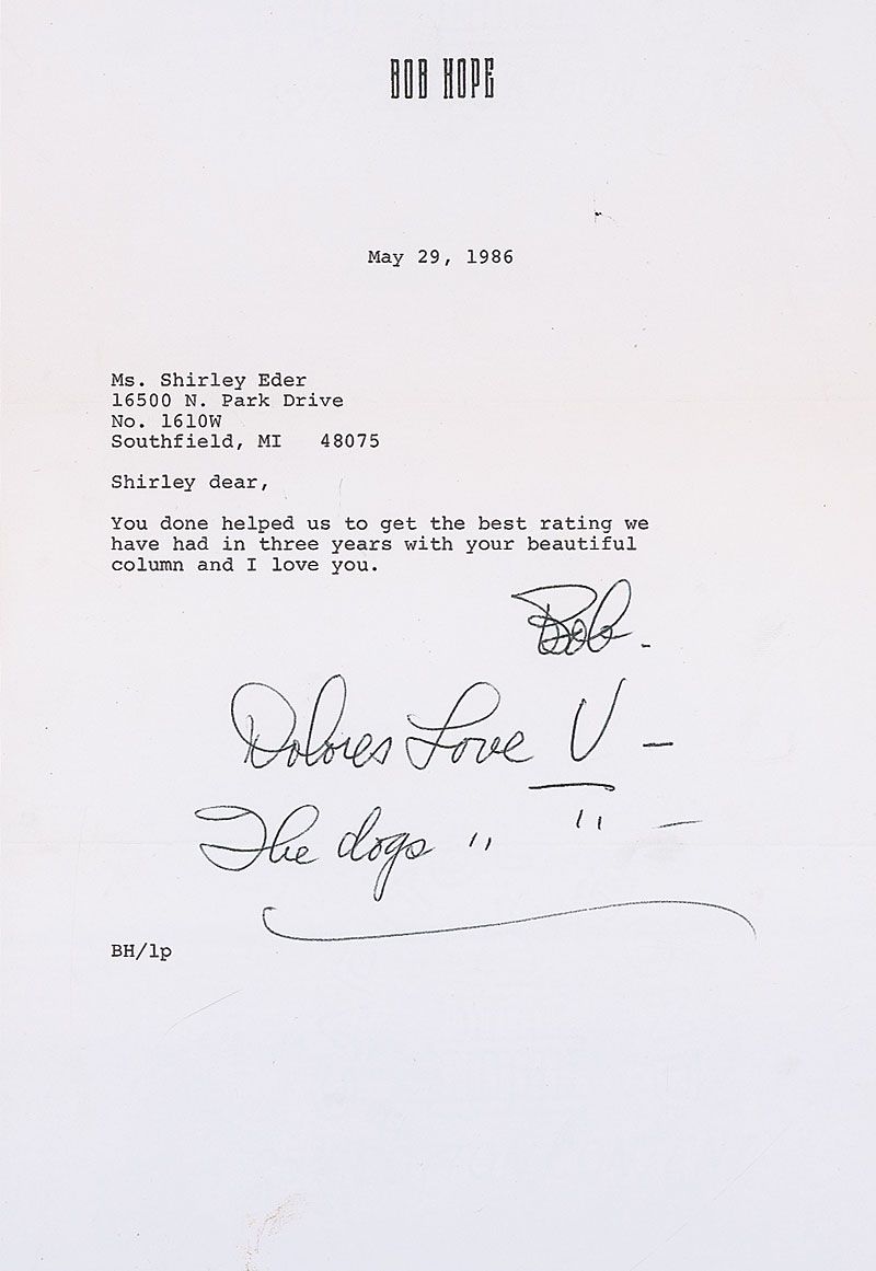 TLS signed “Bob,” one page, 7.25 x 10.5, personal letterhead, May 29, 1986. Letter to the beloved Detroit entertainment columnist Shirley Eder, in full: “You done helped us to get the best rating we have had in three years with your beautiful column and I love you.” Under his signature, Hope has added a short handwritten postscript which reads, “Dolores love U—The dogs [ditto].” In fine condition, with minor soiling to lower edge. Accompanied by the original mailing envelope.