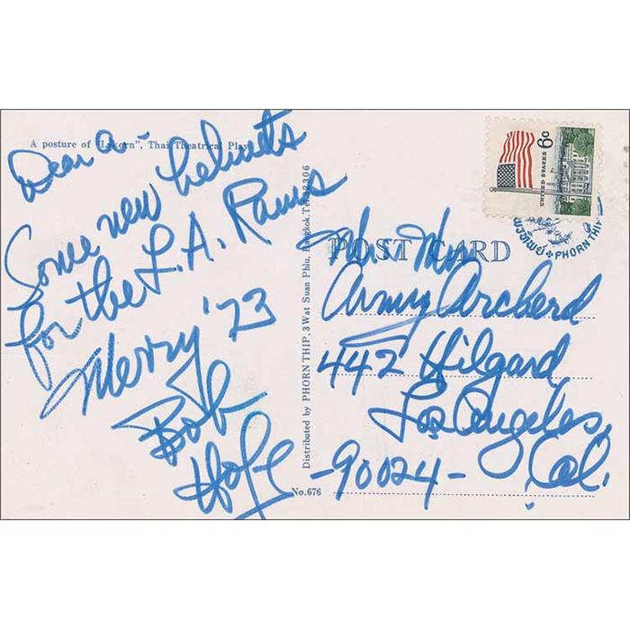 ALS, on the correspondence side of a picture postcard, 5.5 x 3.5, 1973. Short letter to Army Archerd, referencing the ornately costumed Thai woman on the front. Hope writes, “Some new helmets for the L. A. Rams. Merry ‘73.” In fine condition. Pre-certified PSA/DNA and RRAuction COA.