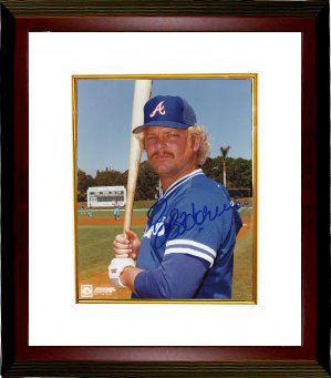 Bob Horner was drafted by Atlanta as the first overall pick of the 1978 amateur draft and made his debut in the same year. He is one of only a handful of players ever to go directly to the starting lineup in the major leagues without spending a day in the minor leagues. He won the National League Rookie of the Year honors over Ozzie Smith. In his ten-year Major League career, Horner batted .277 with 218 home runs, 685 RBIs, 560 runs, 1047 hits,169 doubles, 8 triples, 14 stolen bases, a .340 on base percentage, and .499 of slugging average in 1020 games. Bob Horner hand autographed Atlanta Braves 8x10 Color Photo. Certificate of Authenticity from Athlon Sports. Custom White Mat and Premium Mahogany Color Framed as shown.
