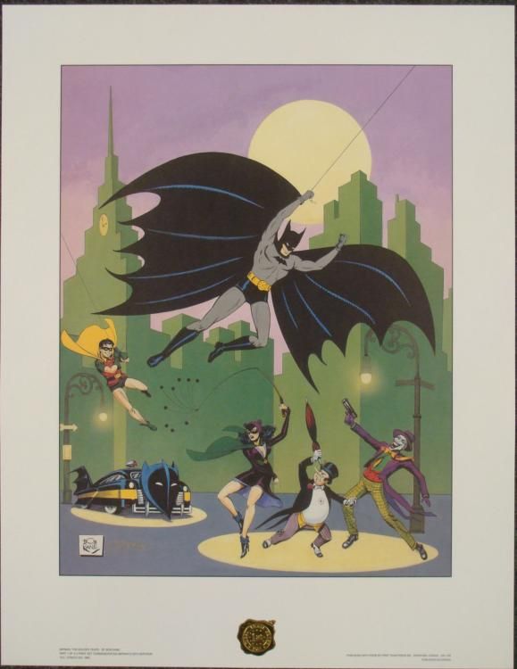 This wonderful piece is commomerating the 50th Anniversay of the ever so popular Batman series. Depicted here are your favorite characters from this hit comic book. * Artist: Bob Kane Title: The Golden Years (Part 1 of 2) Medium: Lithograph print on paper Edition: Numbered Printers Proof out of 75 marked PP Size of Image: 12 7/8" x 16 3/4" Size of Paper: 16 3/4" x 21 5/8" Publication: First Team Press, Inc Gold Publisher stamp at lower center Date: 1989 Condition: Excellent Biography * Bob Kane (born Robert Kahn; October 24, 1915 - November 3, 1998) was an American comic book artist and writer, credited as the creator of the DC Comics superhero Batman. He was inducted into both the comic book industry's Jack Kirby Hall of Fame in 1994 and the Will Eisner Comic Book Hall of Fame in 1996. * In early 1939, DC's success with the seminal superhero Superman in Action Comics prompted editors to scramble for more such heroes. In response, Bob Kane conceived "the Bat-Man". Kane said his influences for the character included actor Douglas Fairbanks' movie portrayal of the swashbuckler Zorro, Leonardo Da Vinci's diagram of the ornithopter, a flying machine with huge bat-like wings; and the 1930 film The Bat Whispers, based on Mary Rinehart's mystery novel The Circular Staircase. In 1943, Kane left the Batman comic books to focus on penciling the daily Batman newspaper comic strip. DC Comics artists ghosting the comic-book stories now included Jack Burnley and Win Mortimer, with Robinson moving up as penciler and Fred Ray contributing some covers. After the strip finished in 1946, Kane returned to the comic books but, unknown to DC, had hired his own personal ghosts, including Lew Schwartz: Lew Schwartz interview, Alter Ego #51 (Aug. 2005) and Sheldon Moldoff from 1953-1967 * Information retrieved from: http://en.wikipedia.org/wiki/Bob_Kane *
