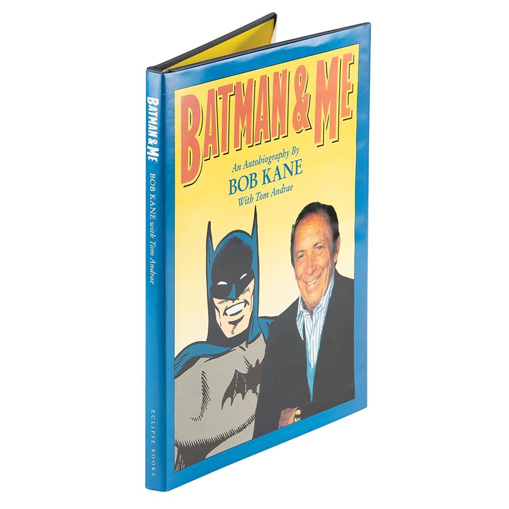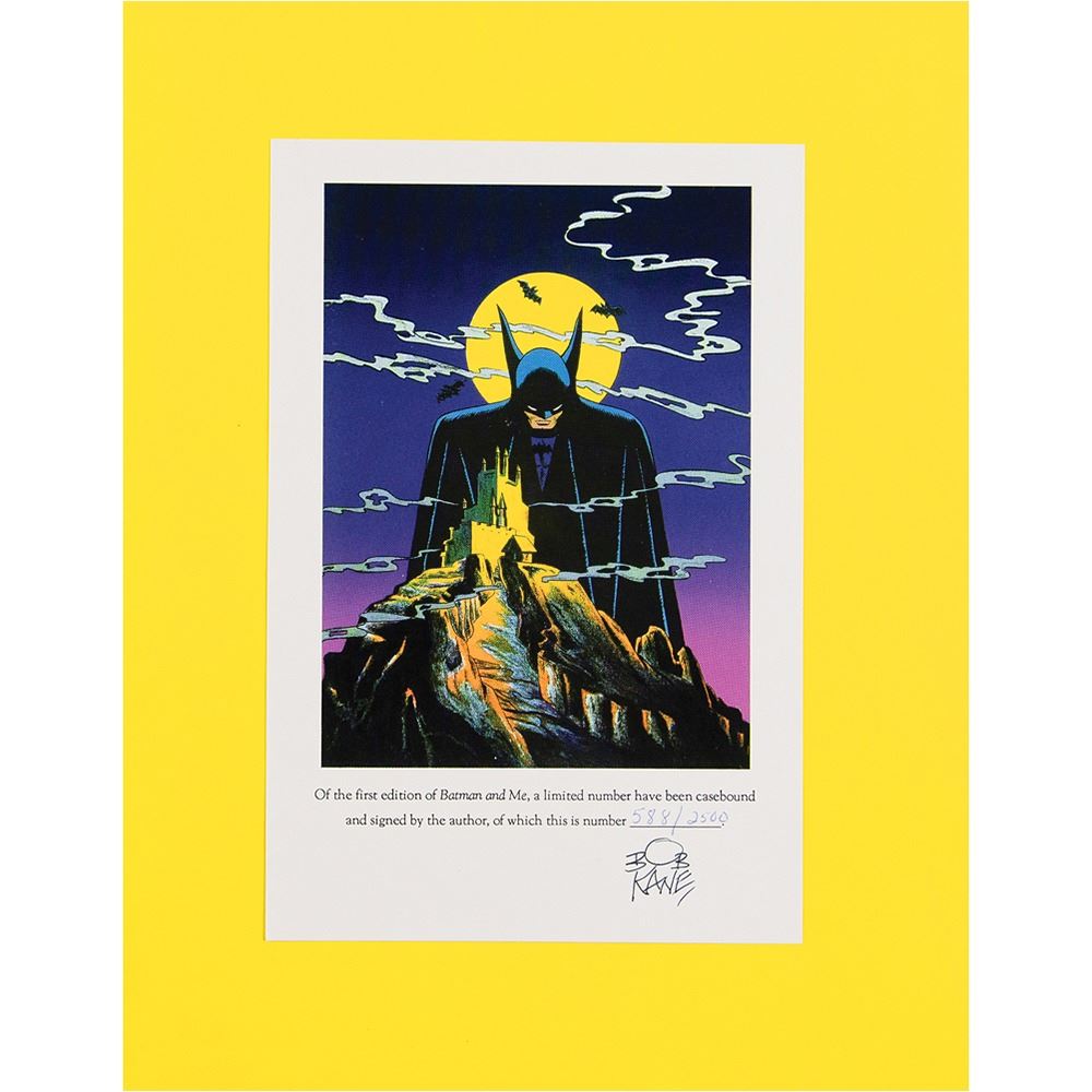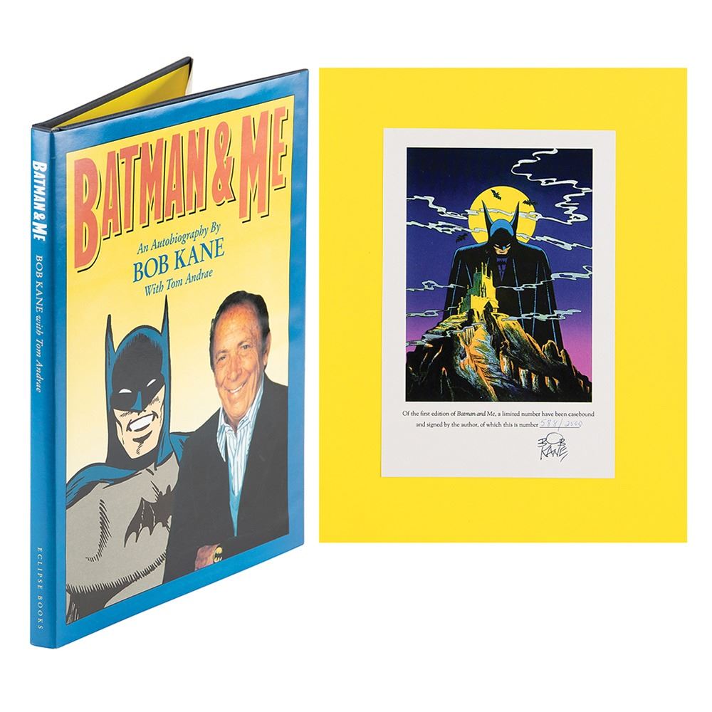 Signed book: Batman & Me. First edition, limited issue, numbered 1394/2500. Forestville, CA: Eclipse Books, 1989. Hardcover with dust jacket, 9 x 11.25, 155 pages. Signed on the limited edition bookplate in black ink by Bob Kane. In fine condition.