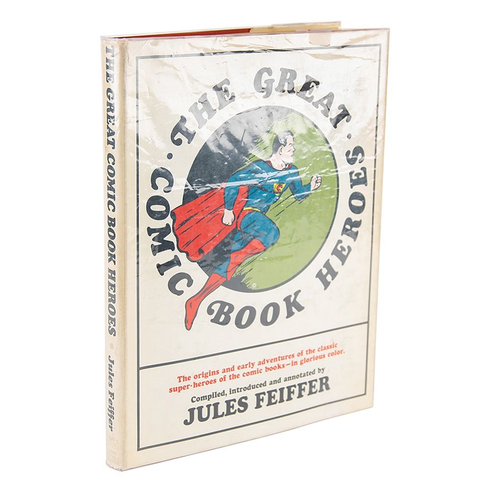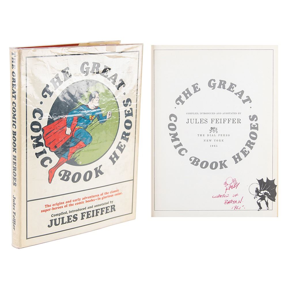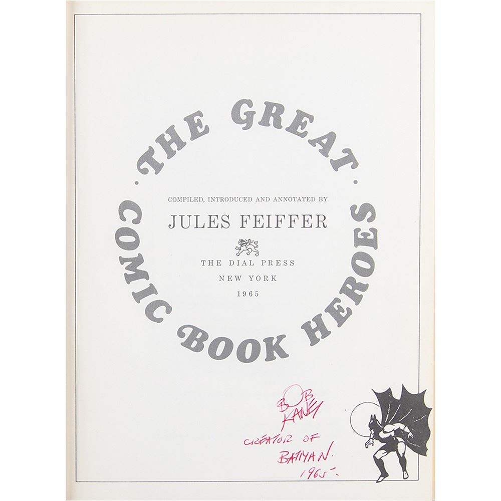 Signed book: The Great Comic Book Heroes. First edition, first printing. NY: The Dial Press, 1965. Hardcover with dust jacket, 9.25 x 12.25, 189 pages. Signed on the title page in red ballpoint, "Bob Kane, Creator of Batman, 1965." In fine condition, with light soiling and wear to the dust jacket.