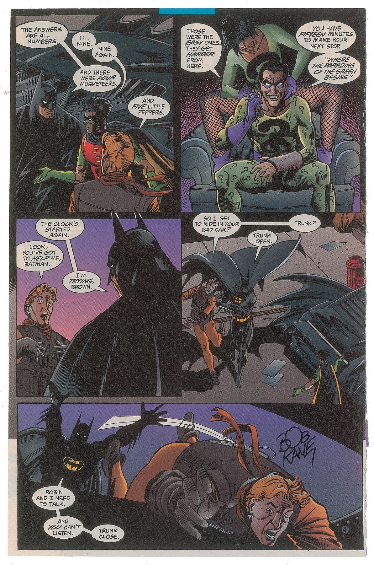 Page removed from a Batman comic book from DC Comics, 6.75 x 10, signed in the last panel in black felt tip by Bob Kane. The comic book page features Batman, Robin, and the Riddler. In fine condition.